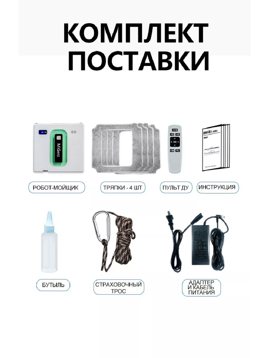 | В комплекте | адаптер питания, моющая тряпка, пульт ДУ, страховочный шнур |