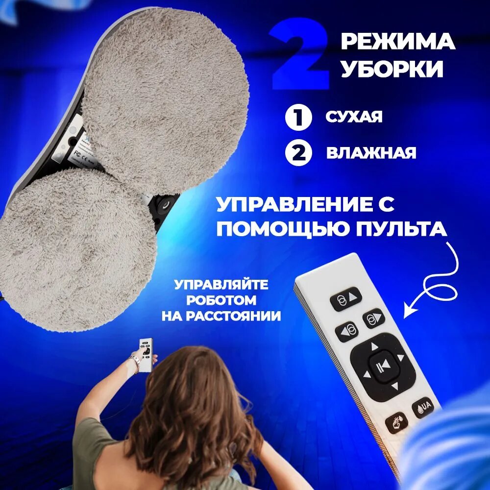 | В комплекте | адаптер питания, моющая тряпка, пульт ДУ, страховочный шнур |
