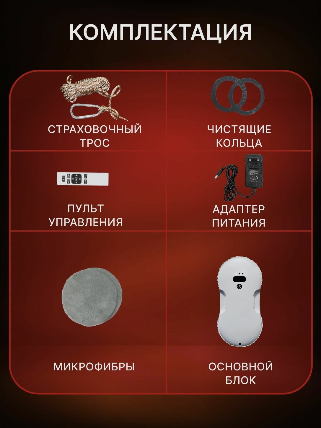 | В комплекте | пульт ДУ, 5м., Стеклоочиститель, блок питания с удлинителем - 4 м., доп. кольца - 2 шт., инструкция, кабель питания -1, салфетки из микрофибры - 10 шт., страховочный трос - 4 м., ёмкость для жидкости |