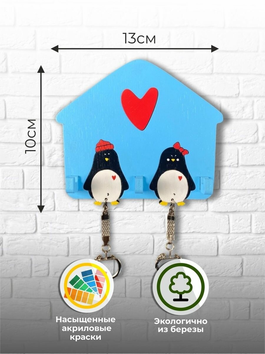 Купить Ключница настенная деревянная с брелками "Пингвины" в синем цвете
