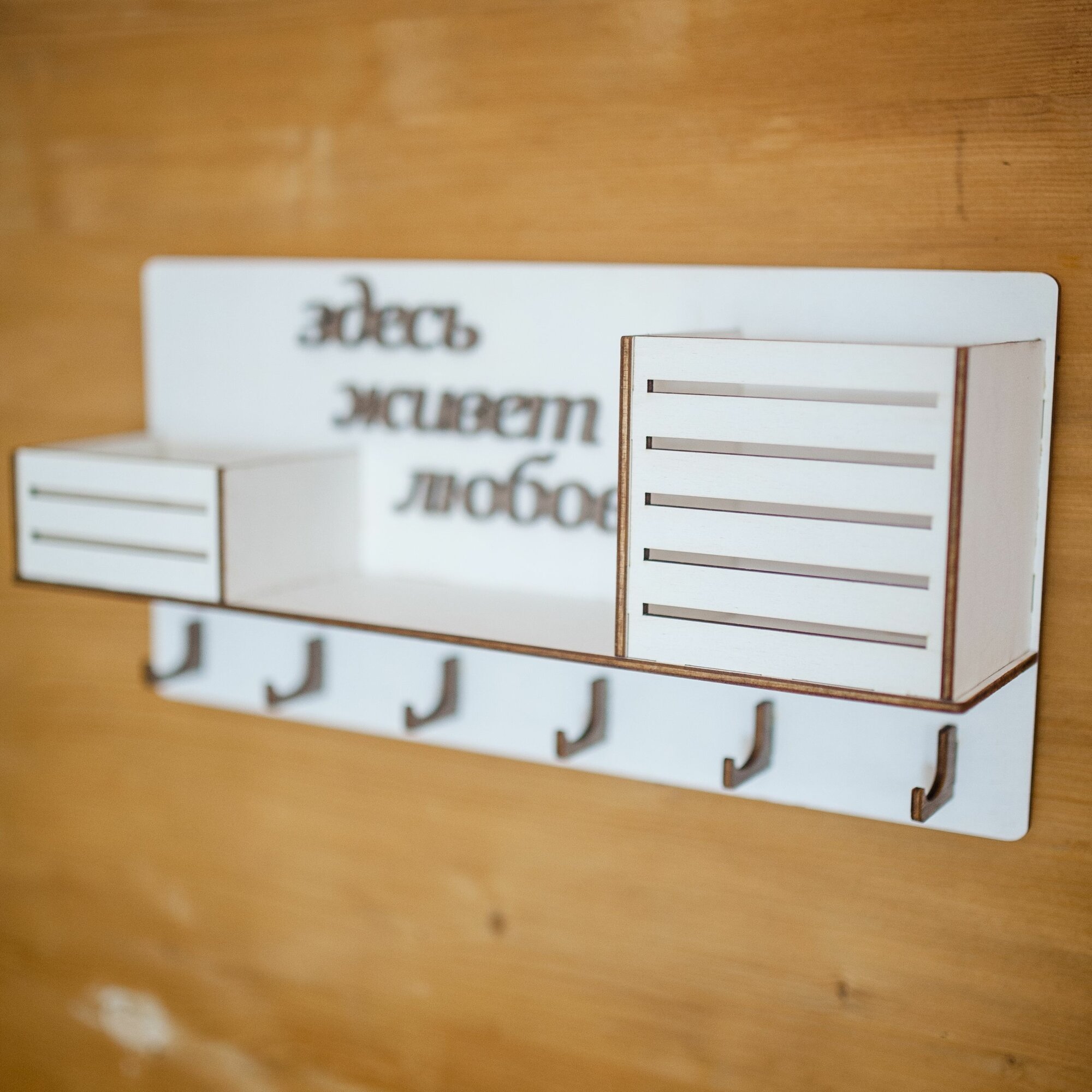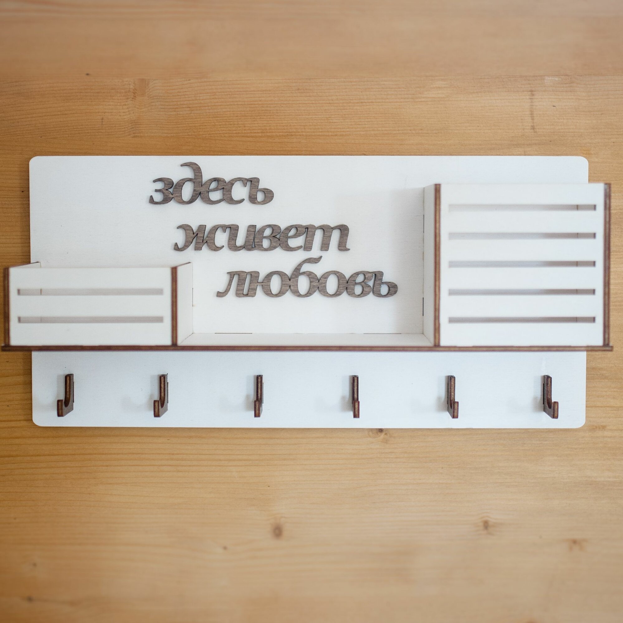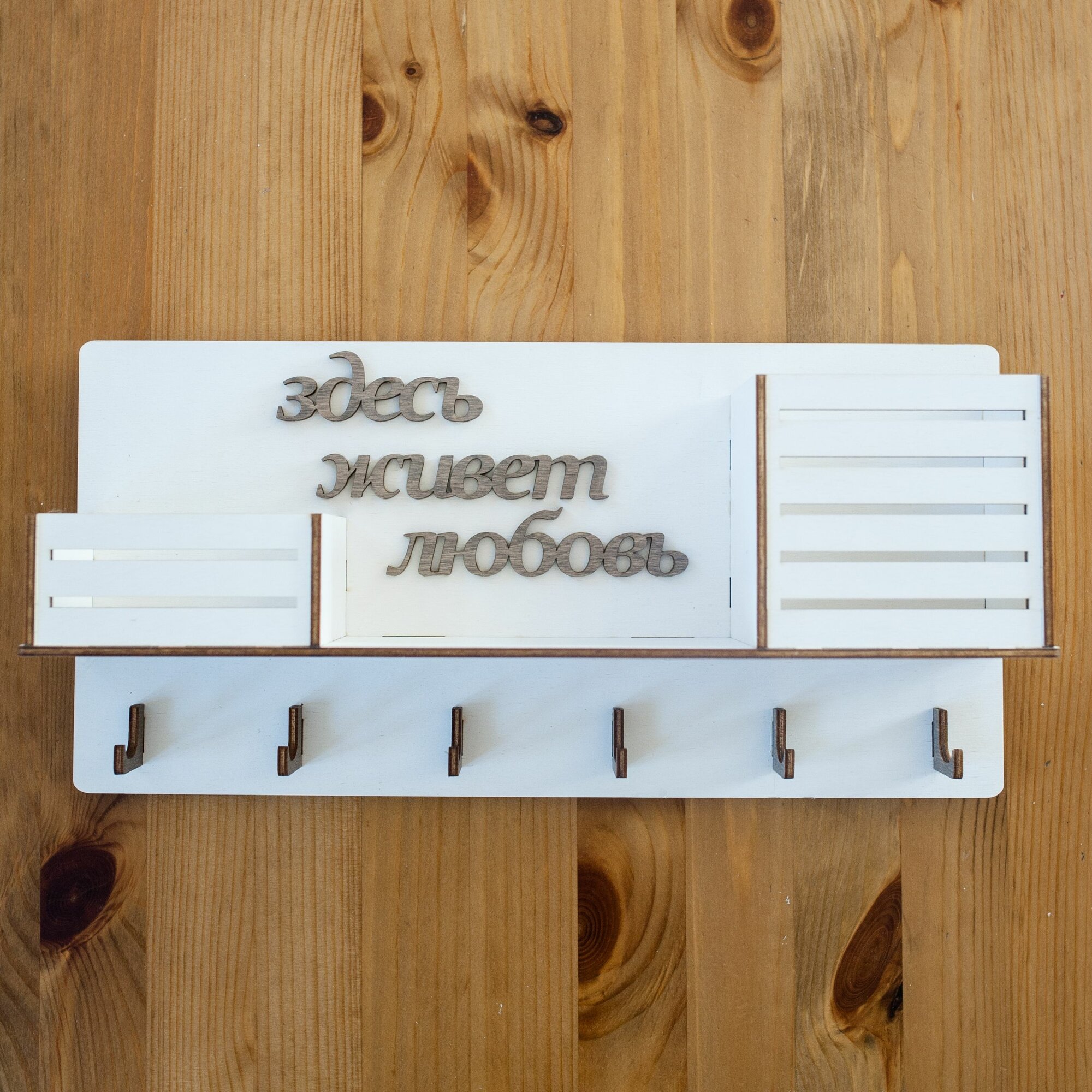 Купить Ключница настенная декоративная большая белая Bezusoff 38 на 19 см с 6 крючками, полочкой и 2 отделениями. Здесь живет любовь.
