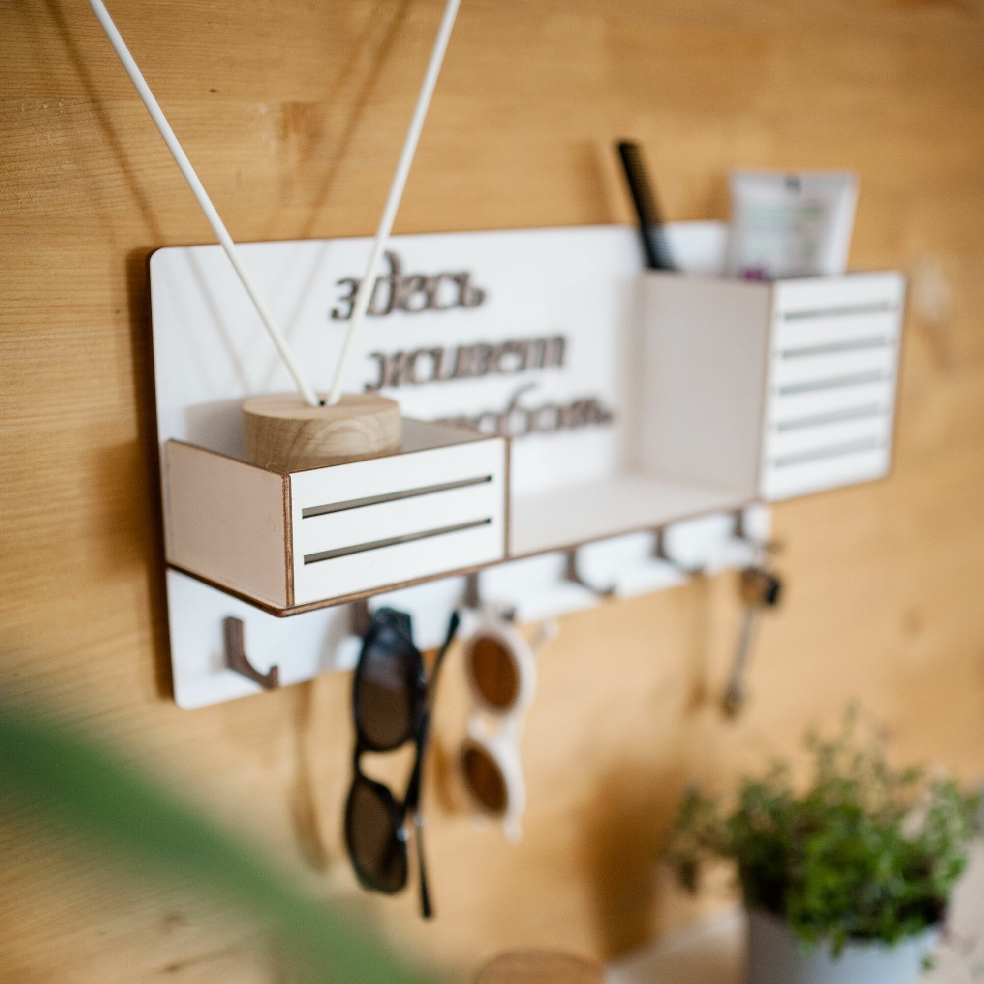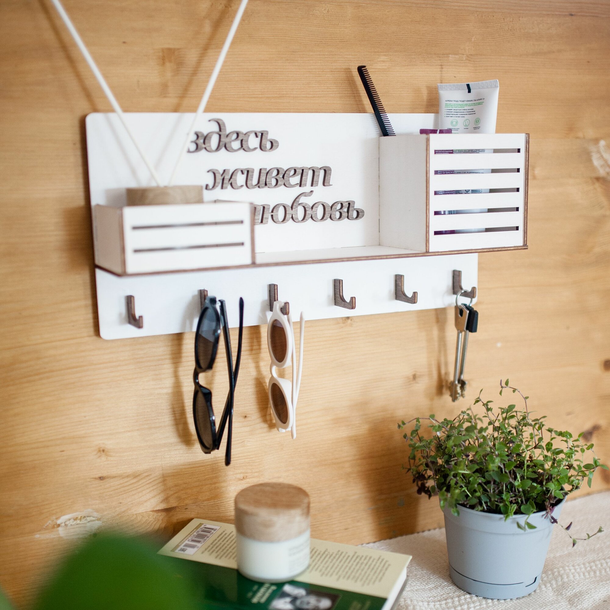 СохранитьКлючница настенная декоративная большая белая Bezusoff 38 на 19 см с 6 крючками, полочкой и 2 отделениями. Здесь живет любовь. интересное: