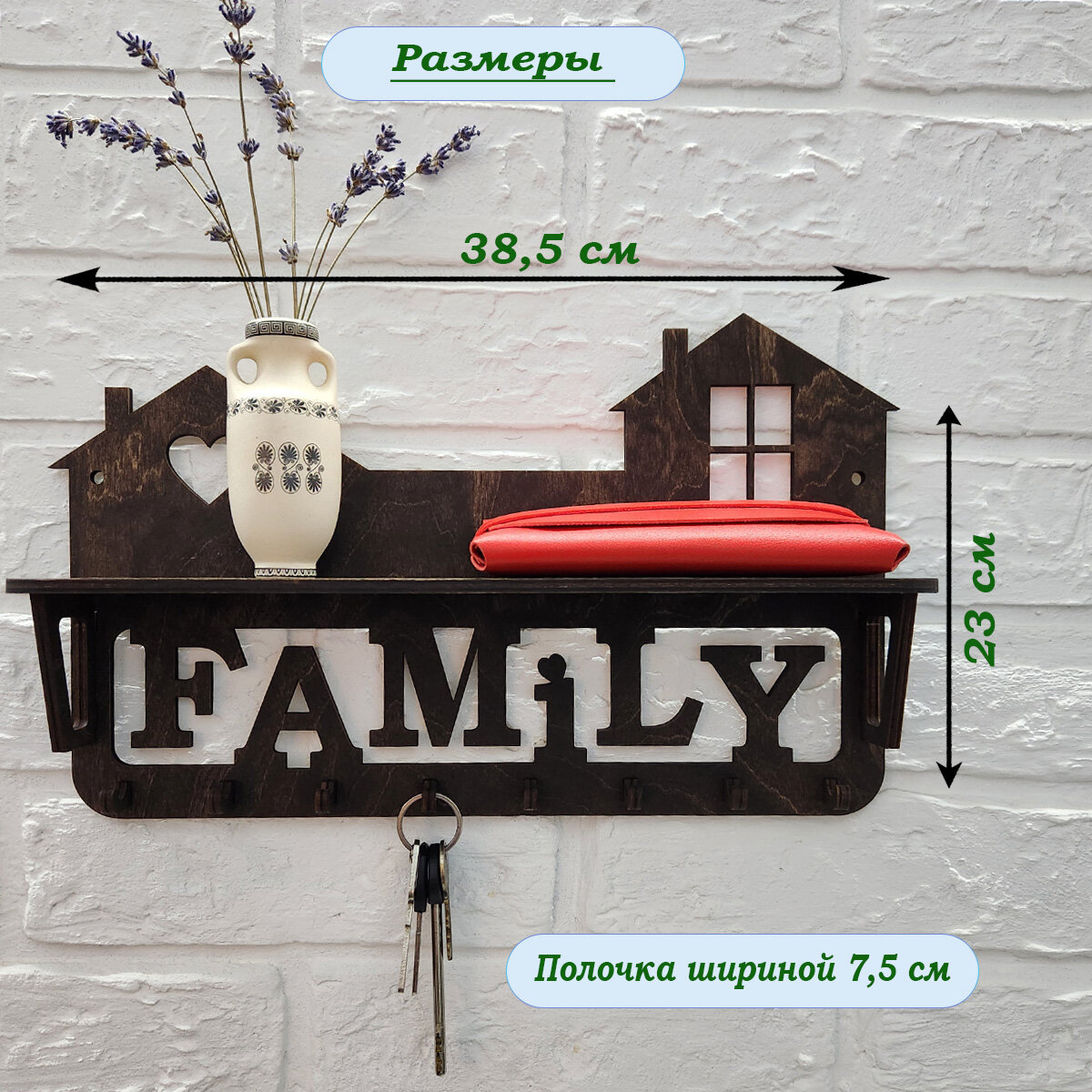 Ключница настенная с полкой деревянная, Полка настенная с крючками, 38х23 см, Nem_wood интересное: