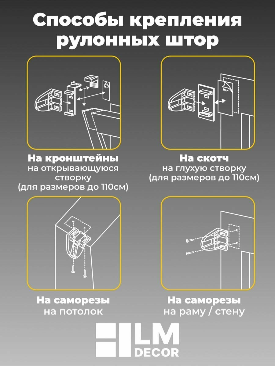 | Дополнительная информация | Плотность ткани 215 г/м2.Несколько вариантов установки: без сверления на пластиковое глухое окно или с поворотно-откидным механизмом; со сверлением - на любое окно, на неподвижную раму, на стену (оконный проем), на раму, к потолку, в проем. |