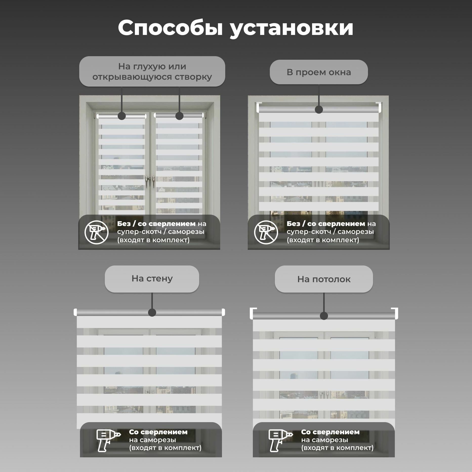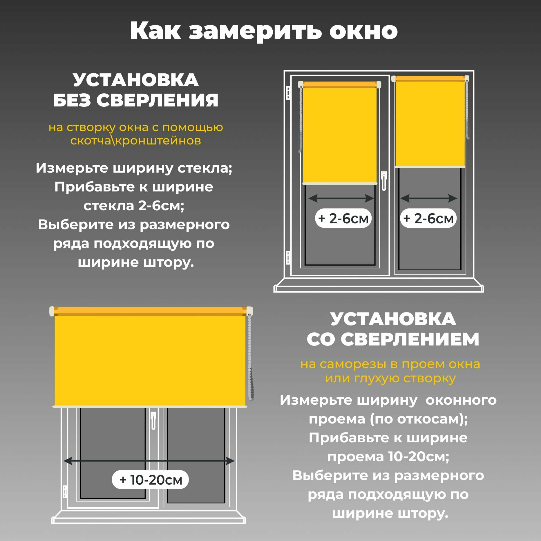 | Дополнительная информация | Плотность ткани 215 г/м2.Несколько вариантов установки: без сверления на пластиковое глухое окно или с поворотно-откидным механизмом; со сверлением - на любое окно, на неподвижную раму, на стену (оконный проем), на раму, к потолку, в проем. |