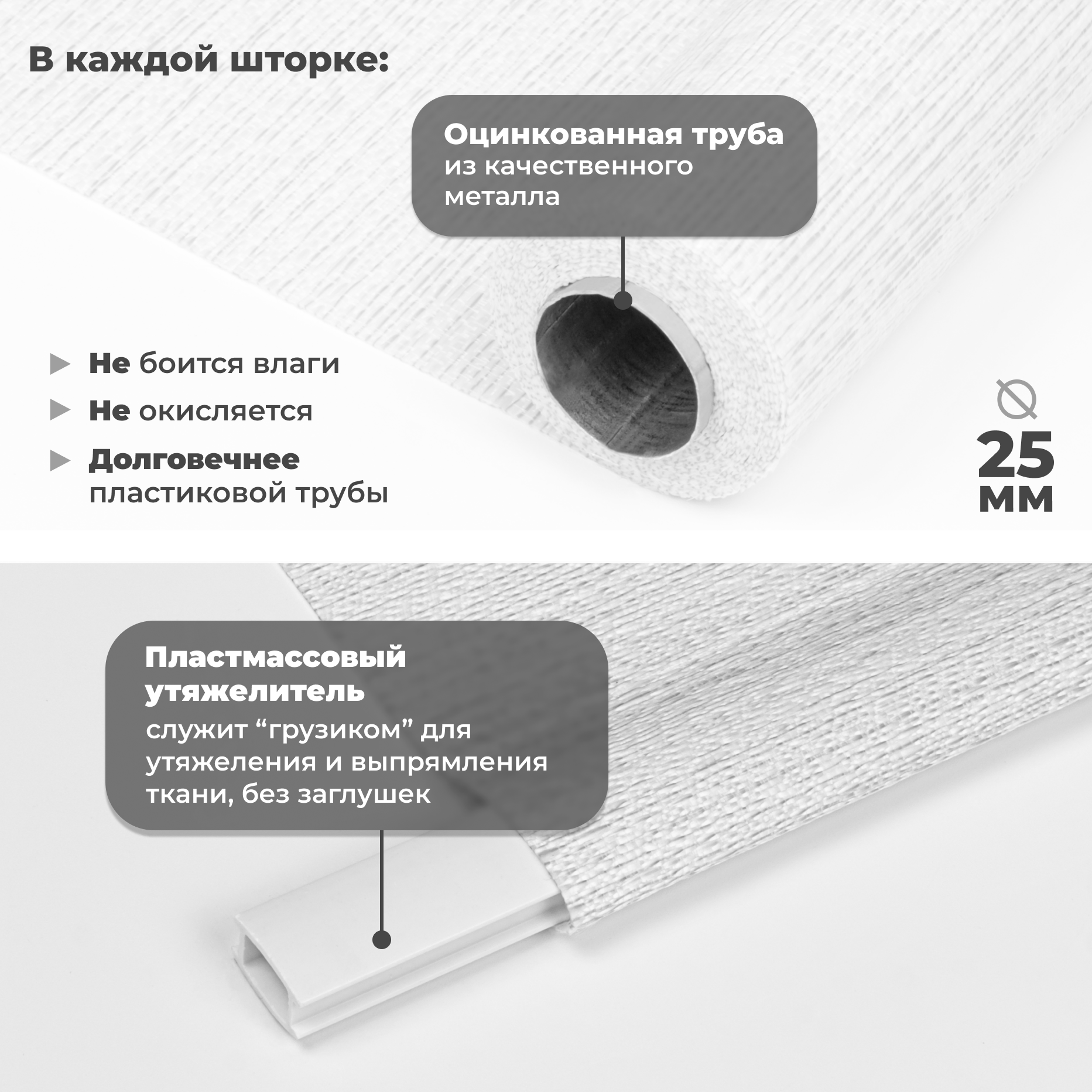 | Комплектация | Рулонная штора на стальном оцинкованном валу 25 мм - 1 шт, утяжелитель пластиковый вшитый - 1шт, боковые стальные кронштейны - 2 шт, пластиковые белые заглушки для кронштейнов - 2 шт, дюбели 6х30 мм - 4 шт, саморезы 3,5х30 мм - 4 шт, механизм управления на цепи 1 шт, ограничитель управления цепи - 1 шт, этикетка и инструкция - 1 шт. |