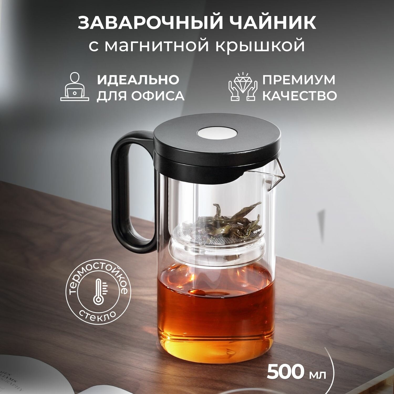 Заварочный чайник Гунфу с фильтром проливной SAMADOYO 500 мл, Стеклянный Чайник с магнитом, Типод с ситечком и кнопкой магнитный, Заварник для горячих напитков стекло