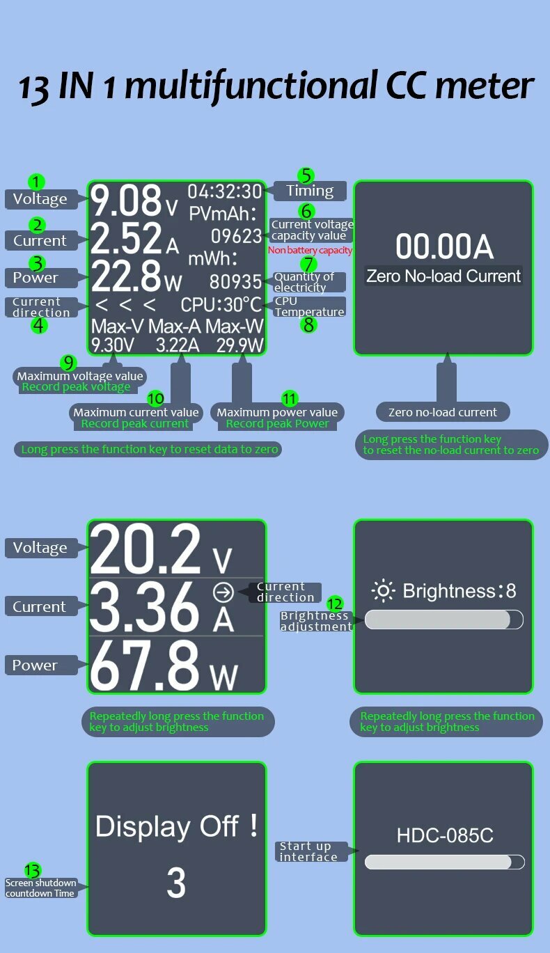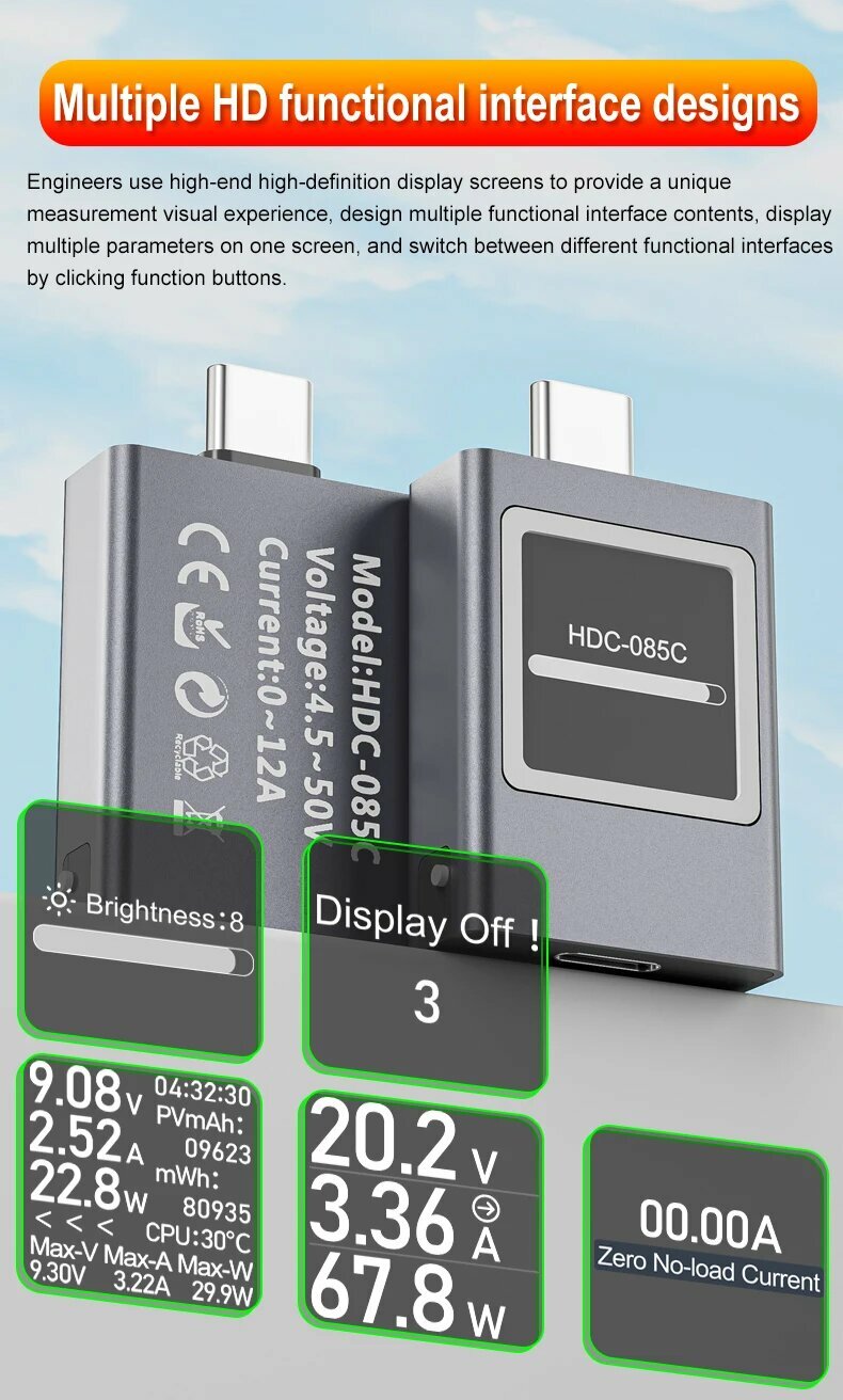 Купить Цифровой вольтметр-амперметр, тестер 13 в 1 с разъемом Type-C для внешних аккумуляторов, 50V 12A