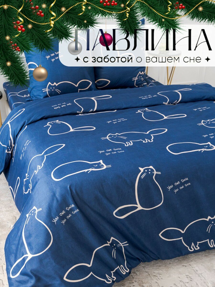 Постельное белье евро Павлина 1955 Коты на синем, Полисатин, наволочки 70x70 интересное: