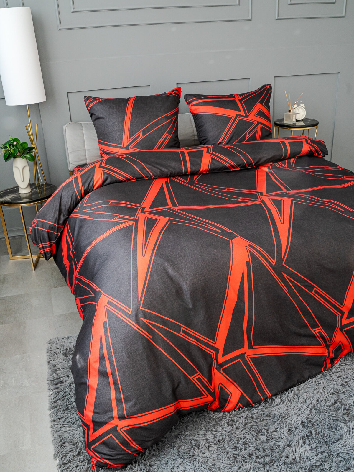 Постельное белье евро макси Павлина Разлом черно-красный, Полисатин, наволочки 70x70