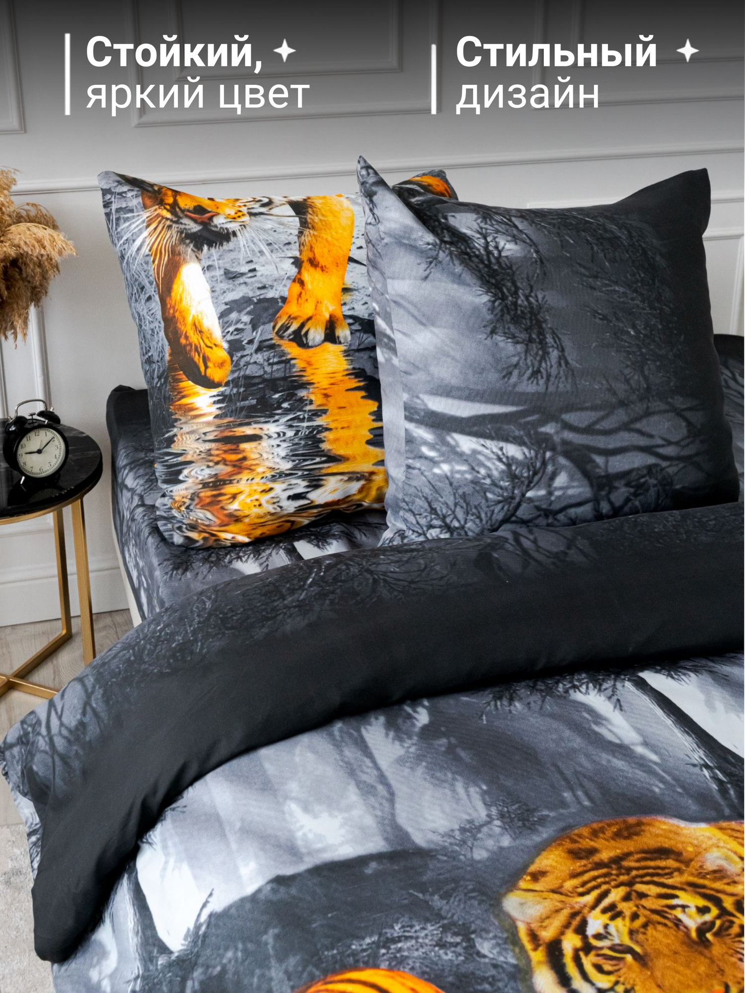 Постельное белье 2 спальное с европростыней Павлина полисатин Тигры рис 3837, черный