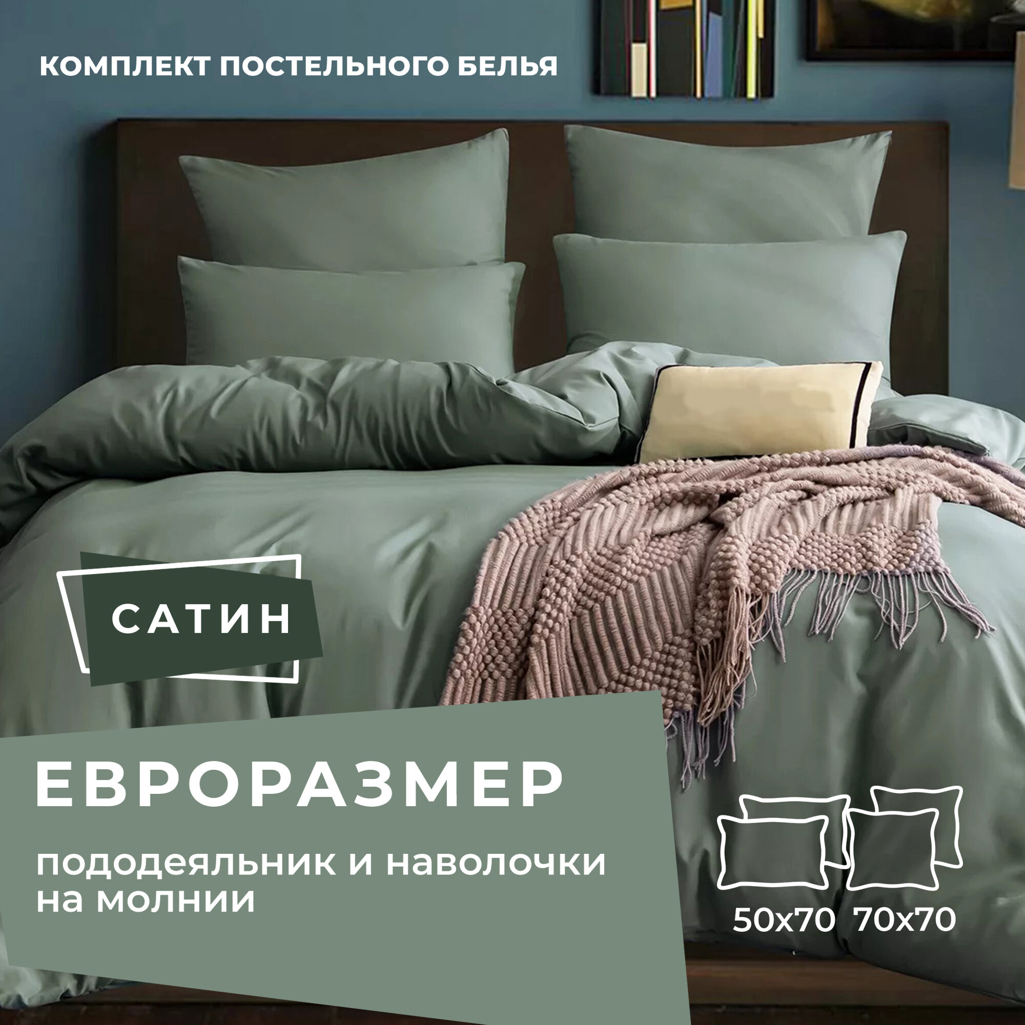 Комплект постельного белья ситрейд Евро однотонный тёмно-зелёный, Сатин, наволочки 50x70, 70x70 по 2 шт.