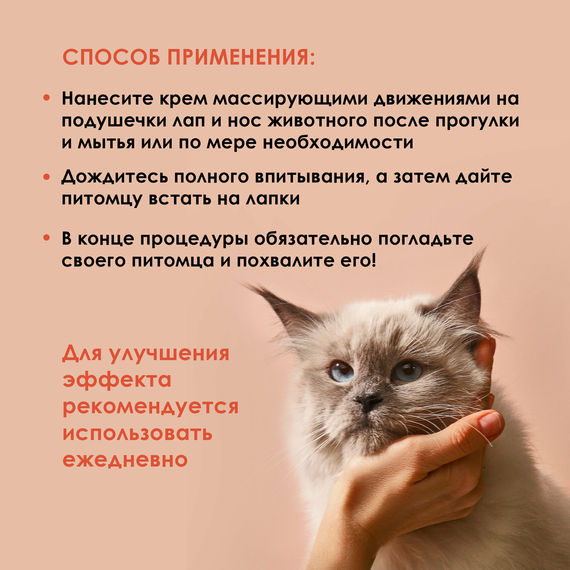 | Способ применения | Нанесите крем массирующими движениями на подушечки лап (включая кожу между пальчиками) и носа животного после прогулки и мытья или по мере необходимости. Желательно дождаться полного впитывания, прежде чем питомец встанет на лапки. Для улучшения эффекта увлажнения, заживления микротрещин, устранения мозолей, шелушений рекомендуется использовать ежедневно. В конце процедуры обязательно погладьте своего питомца и похвалите его! |