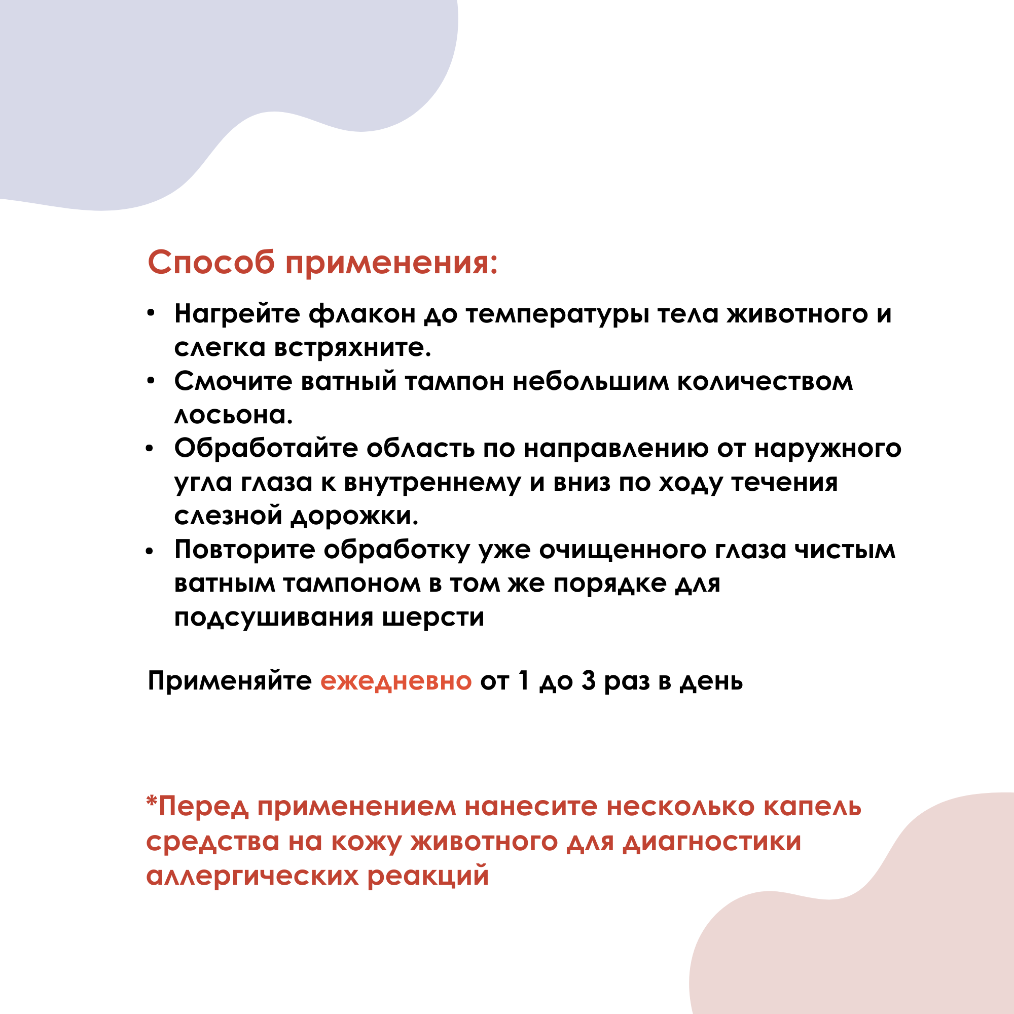 | Способ применения | Нагрейте флакон до температуры тела животного и слегка встряхните. Смочите ватный тампон небольшим количеством лосьона и обработайте область по направлению от наружного угла глаза к внутреннему и вниз по ходу течения слезной дорожки. Повторите обработку уже очищенного глаза чистым ватным тампоном в том же порядке для подсушивания шерсти. Перед применением нанесите несколько капель средства на кожу животного для диагностики аллергических реакций. |