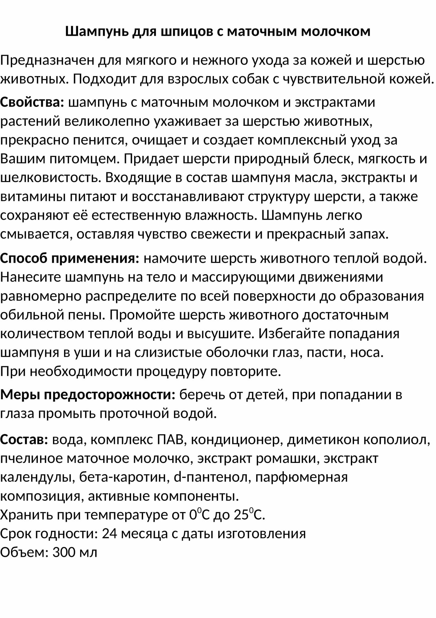 | Подробная комплектация | Шампунь для шпицев с маточным молочком 300мл - 1 шт |