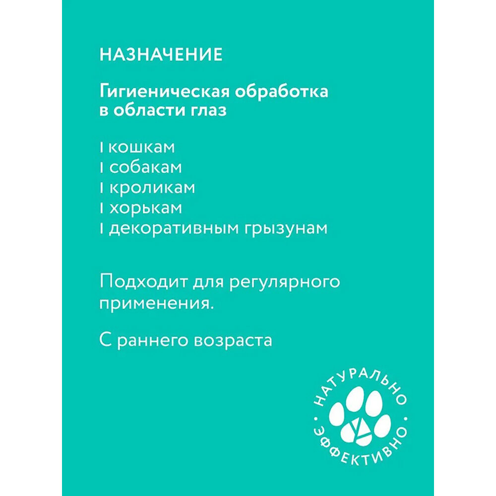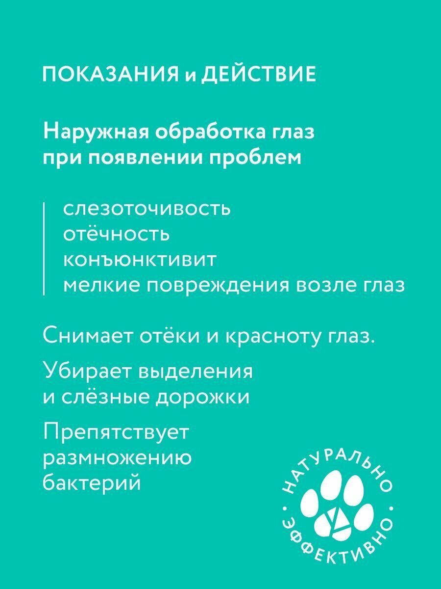| Дополнительная информация | применяется при слезоточивости, отечности, конъюнктивите, мелких повреждениях возле глаз; гипоаллергенно; вскрытый флакон следует хранить в холодильнике (от +4º до +8º) с закупоренной резиновой пробкой не более 5 дней; перед применением лосьон следует нагреть до комнатной температуры и встряхнуть |