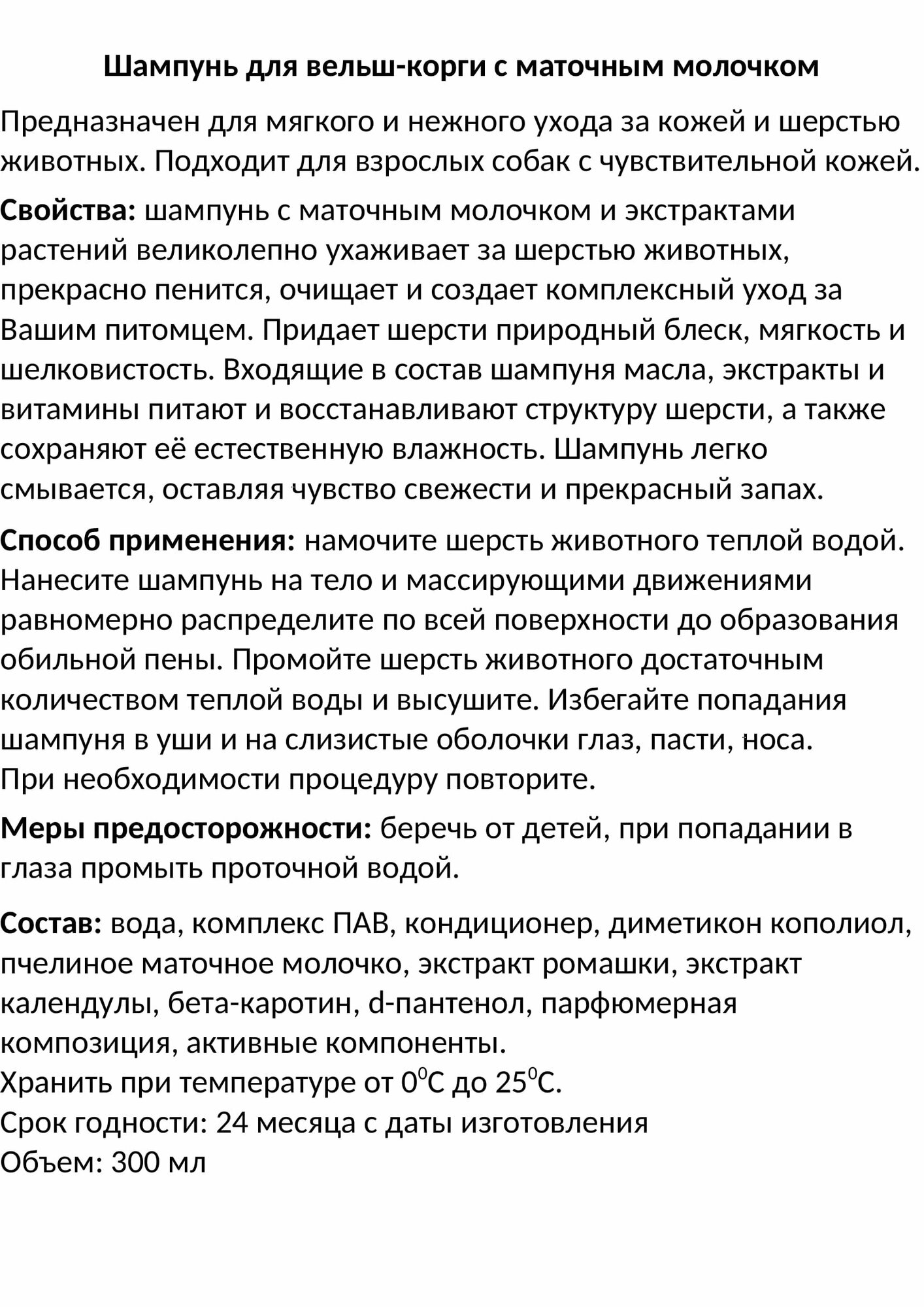 | Подробная комплектация | Шампунь для вельш-корги с маточным молочком 300мл - 1 шт |