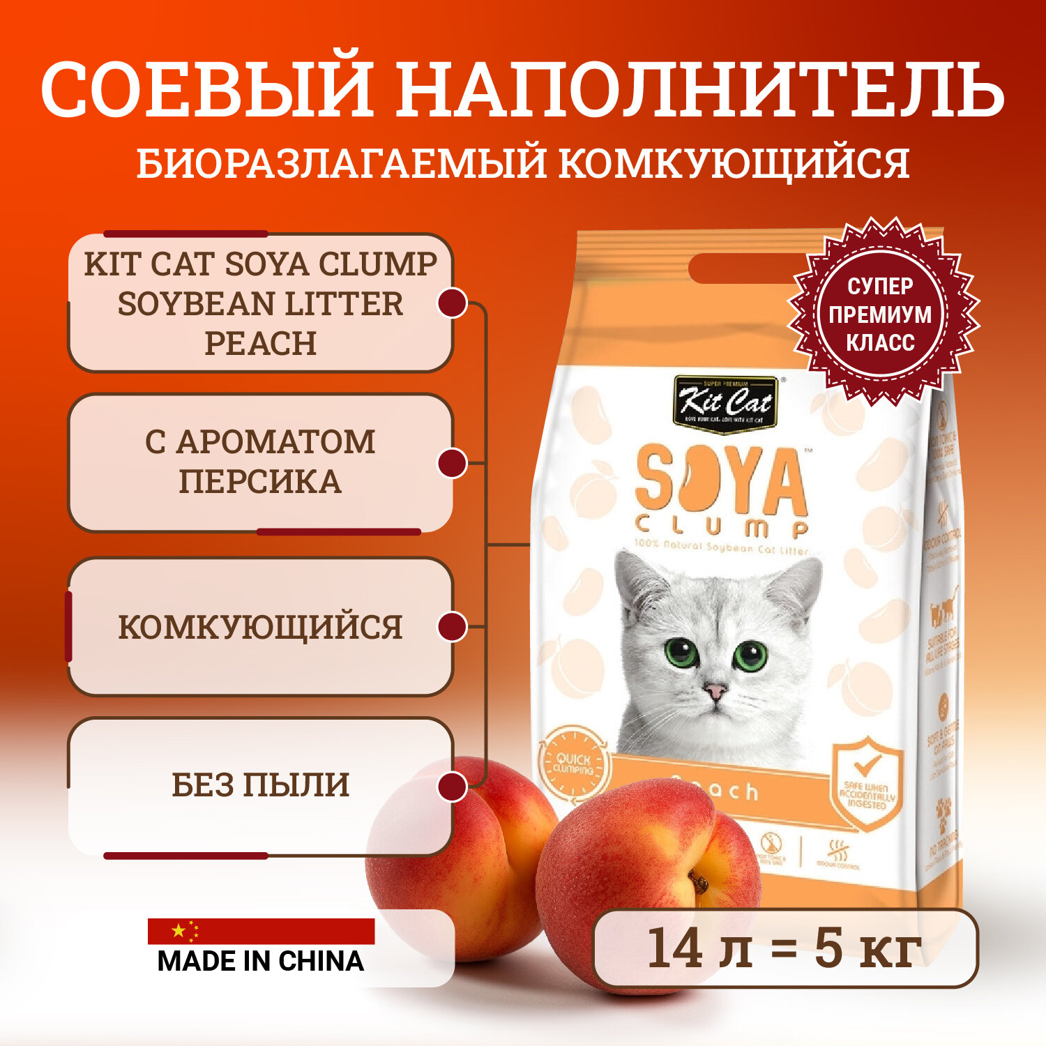 Kit Cat SoyaClump Soybean Litter Peach соевый биоразлагаемый комкующийся наполнитель с ароматом персика - 5 кг интересное:
