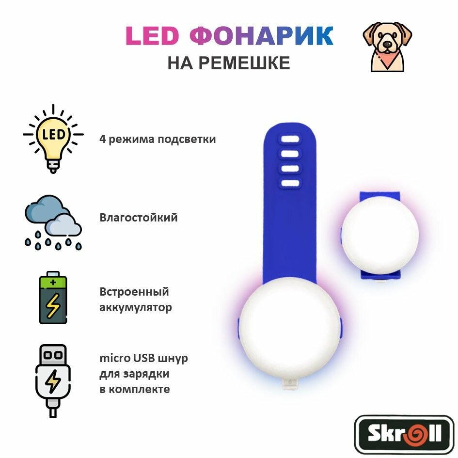 Светящийся брелок на ошейник для собак Skroll на ремешке, светодиодный LED фонарик micro USB / Блинкер / Синий интересное: