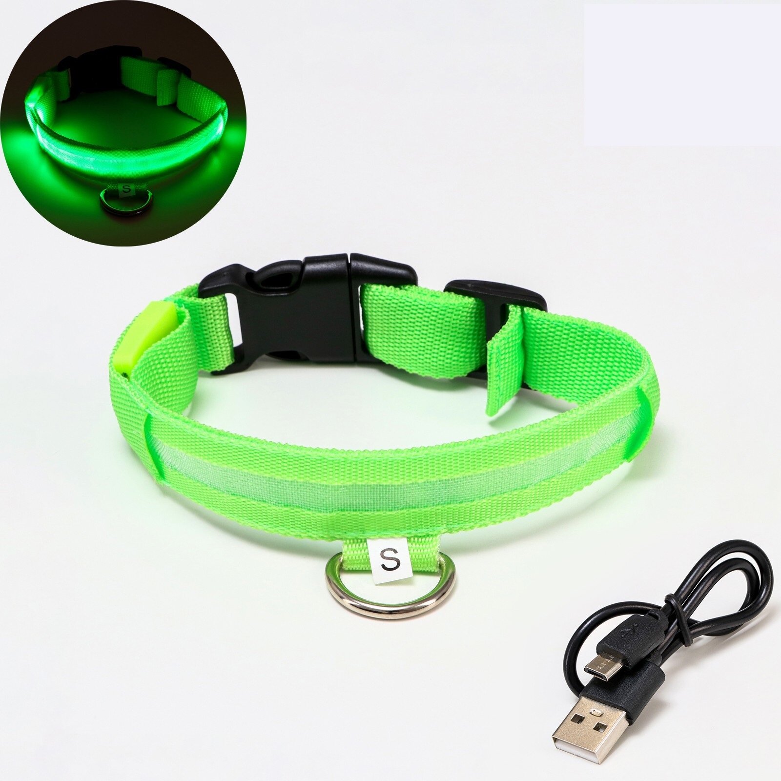 Купить Ошейник с подсветкой, зарядка от USB, размер XS, ОШ 28-38 см, 3 режима, зелёный, 1698436