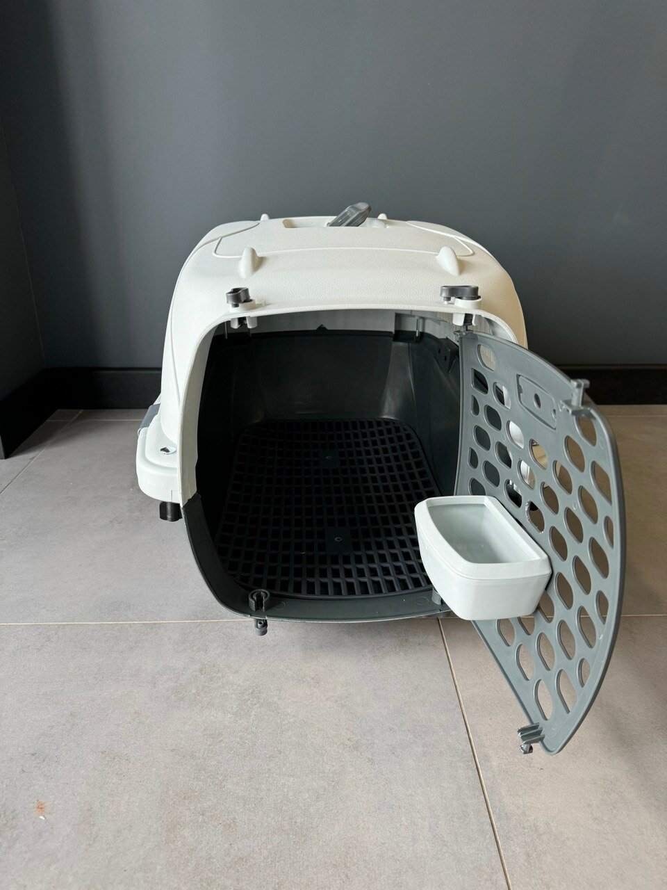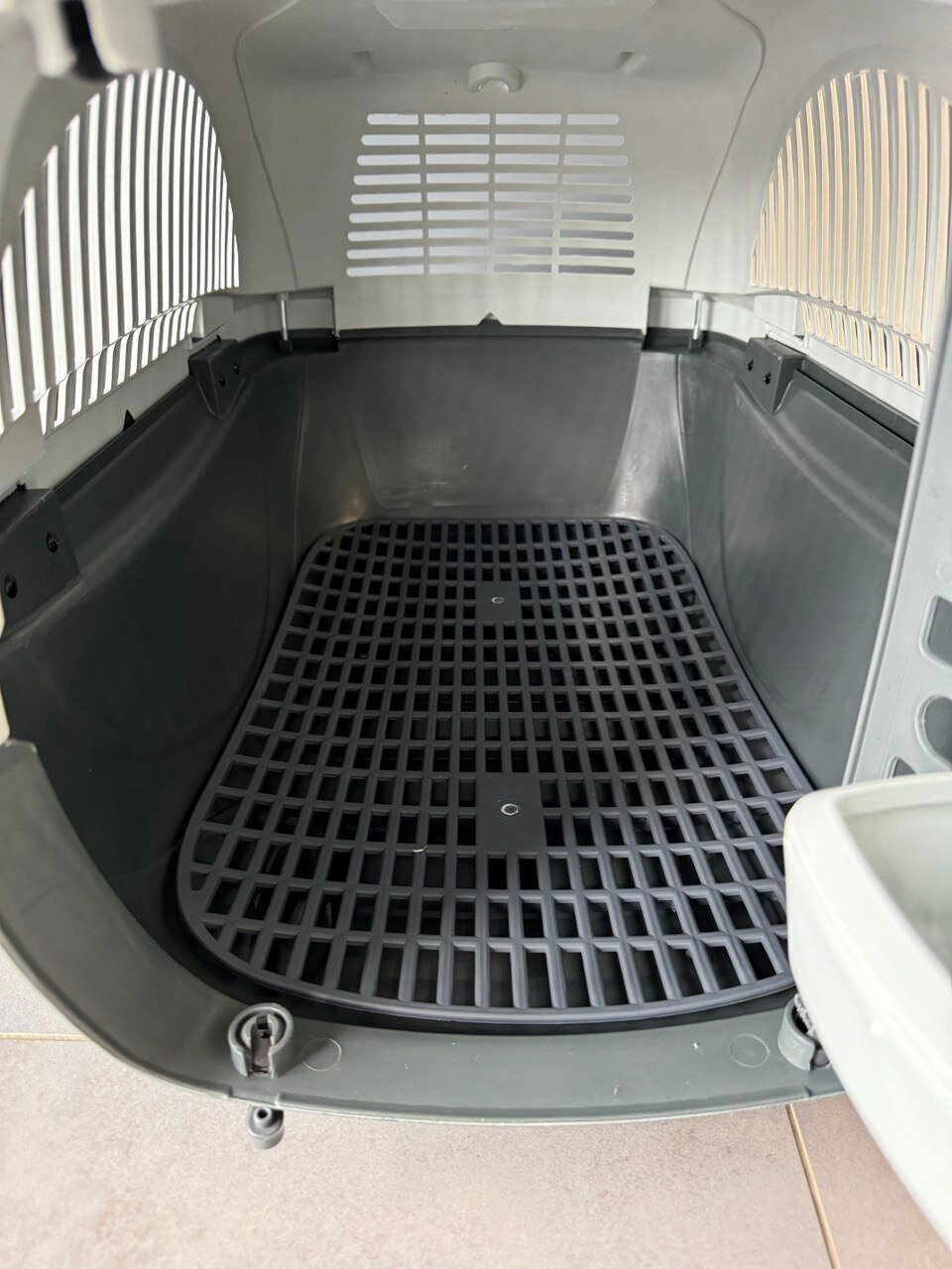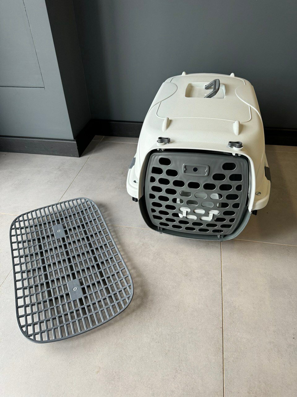 Купить Переноска для кошек "Чистый Котик" с поилкой и сеткой серый, пластик 60x40x42,5 см