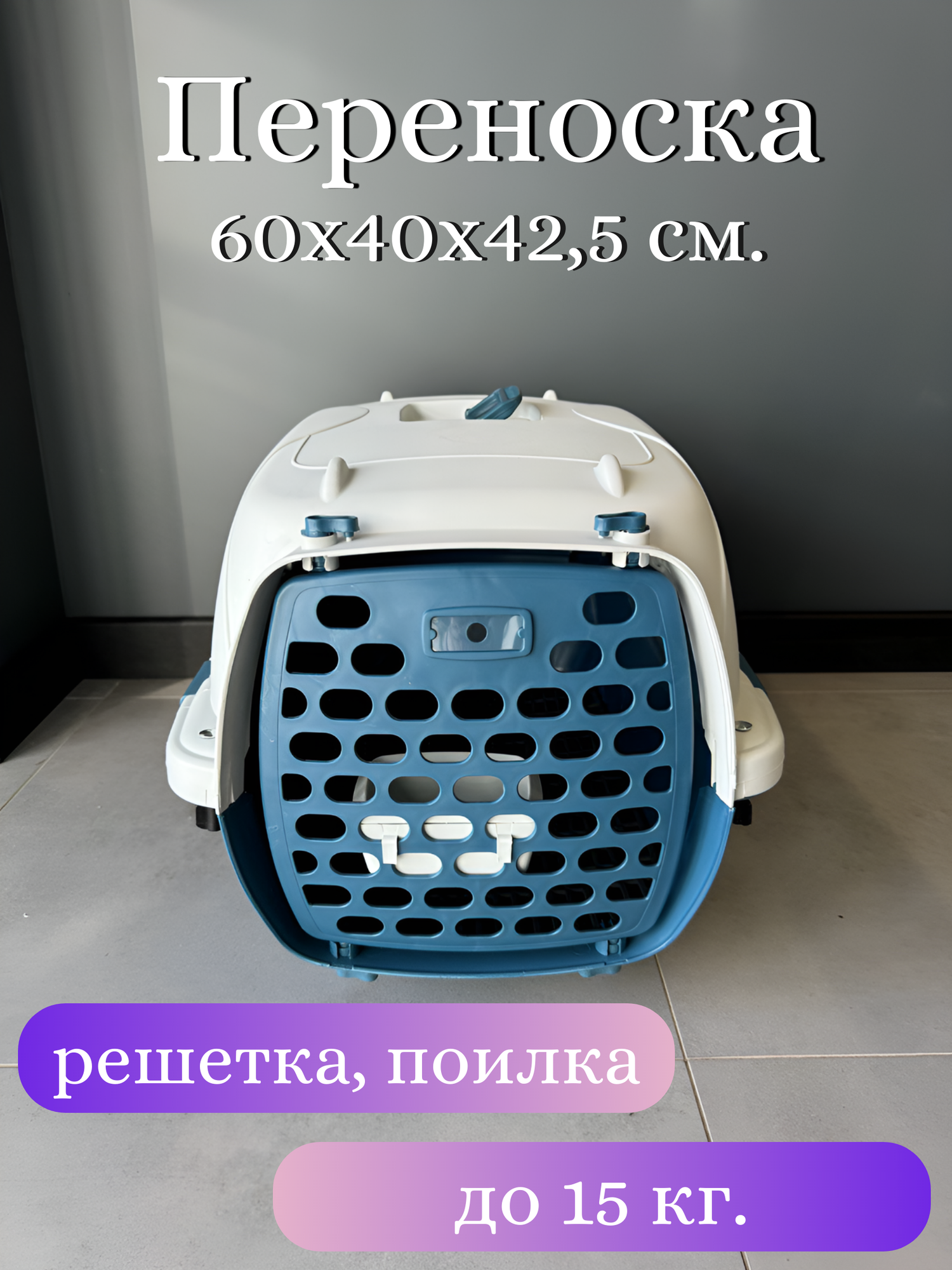 Купить Переноска для кошек "Чистый Котик" с поилкой и сеткой синий, пластик 60x40x42,5 см