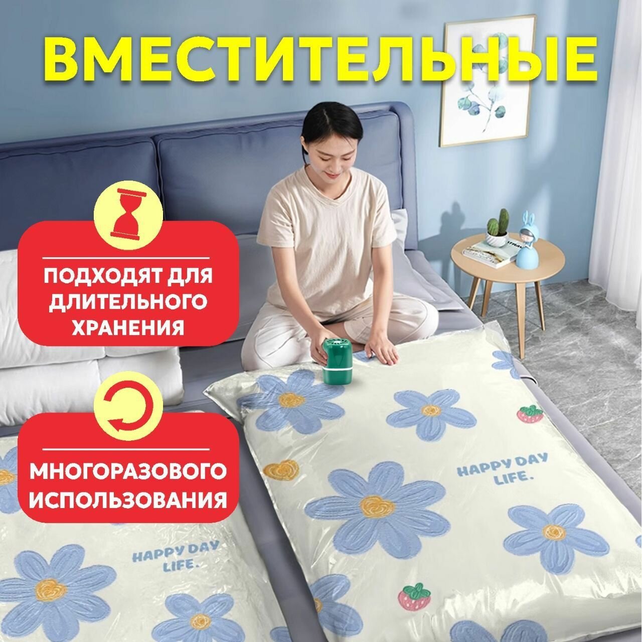 Вакуумные многоразовые пакеты для одежды, одеял и подушек с насосом 8шт