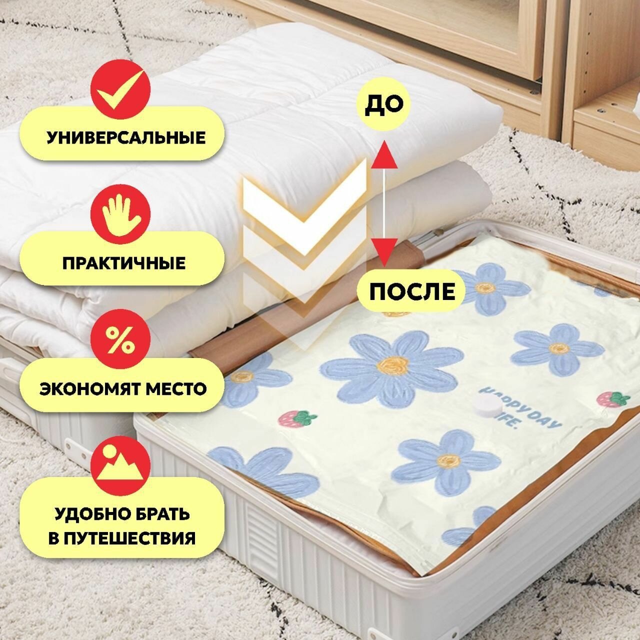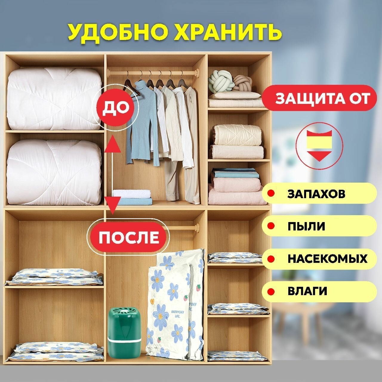Набор вакуумных пакетов для одежды и белья, пакеты с клапаном и насосом 9шт. интересное: