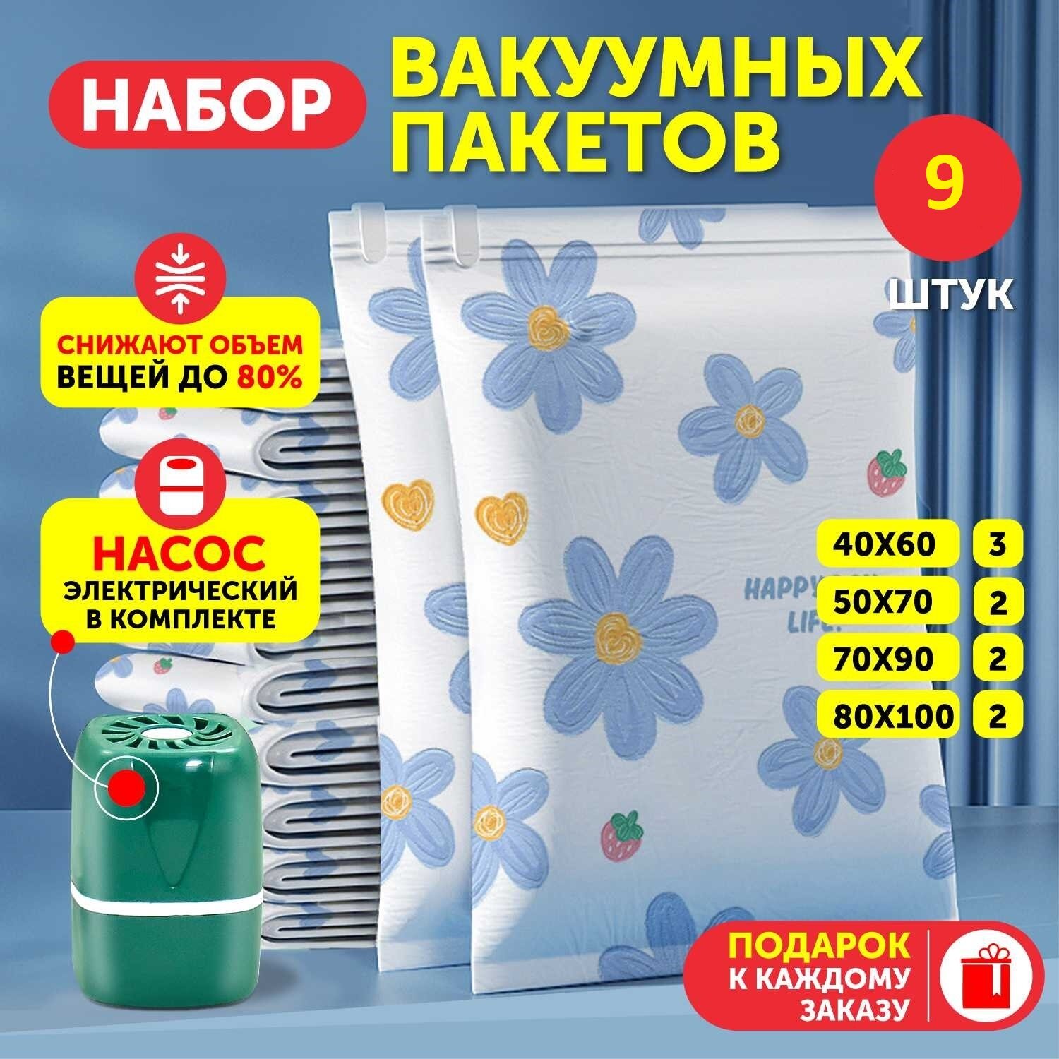 Купить Набор вакуумных пакетов для одежды и белья, пакеты с клапаном и насосом 9шт.