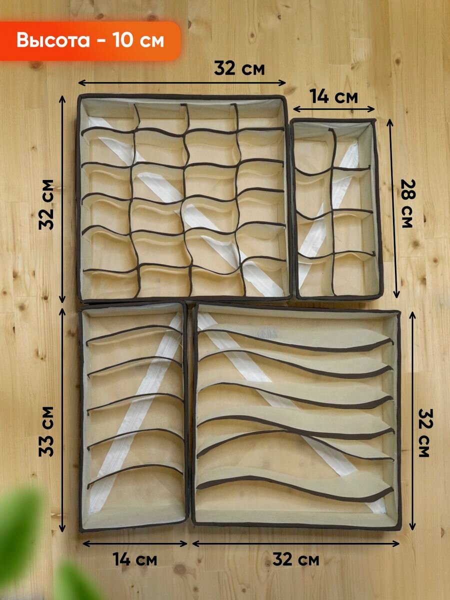 Органайзер для хранения вещей, нижнего белья, бюстгалтеров и носков в шкафу, складной, с разделителями, набор 4 шт, светло-бежевый