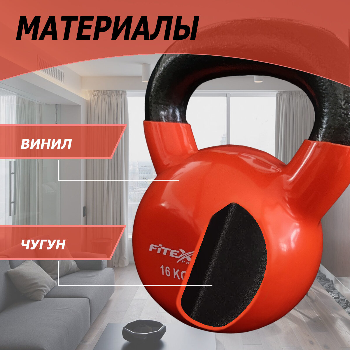 Гиря 16 кг спортивная для фитнеса чугунная в виниловой оболочке цельная FTX2201-16 интересное: