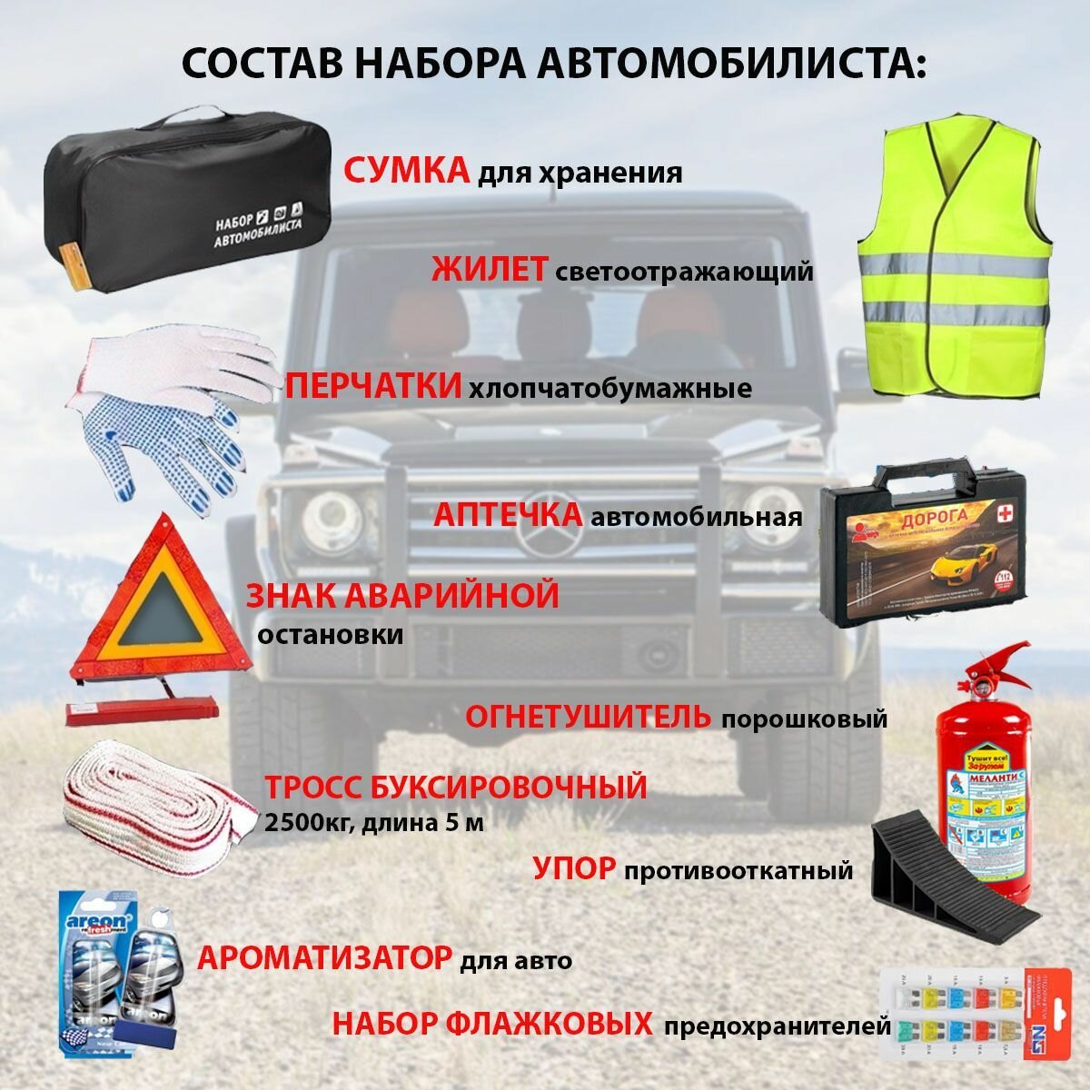 | Подробная комплектация | В комплект входит: 1. Сумка для хранения и переноски всех комплектующих 2. Аптечка автомобильная 3. Знак аварийной остановки. 4. Жилет светоотражающий (салатовый) 5. Трос буксировочный 3 т 6. Огнетушитель 7. Перчатки ХБ 8. Стоппер 9. Ароматизатор для автомобиля 10. Набор флажковых предохранителей с пинцетом |
