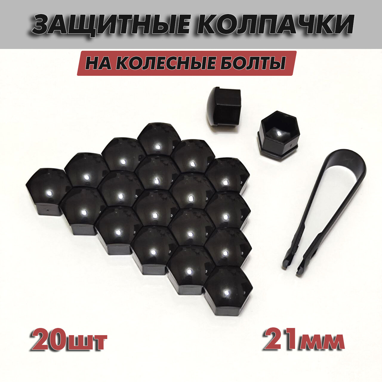 Купить Защитные колпачки на колесные болты и гайки черные, 21мм, 20шт, съемник в комплекте