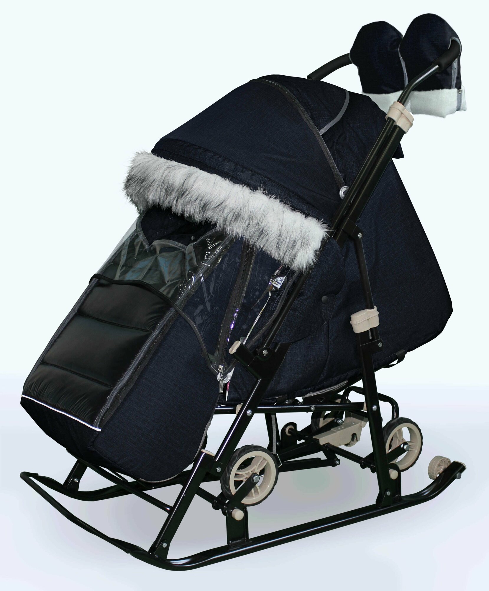 Купить Утепленные санки-коляска с перекидной ручкой Galaxy Glory Gloss темно-синий лен в максимальной комплектации