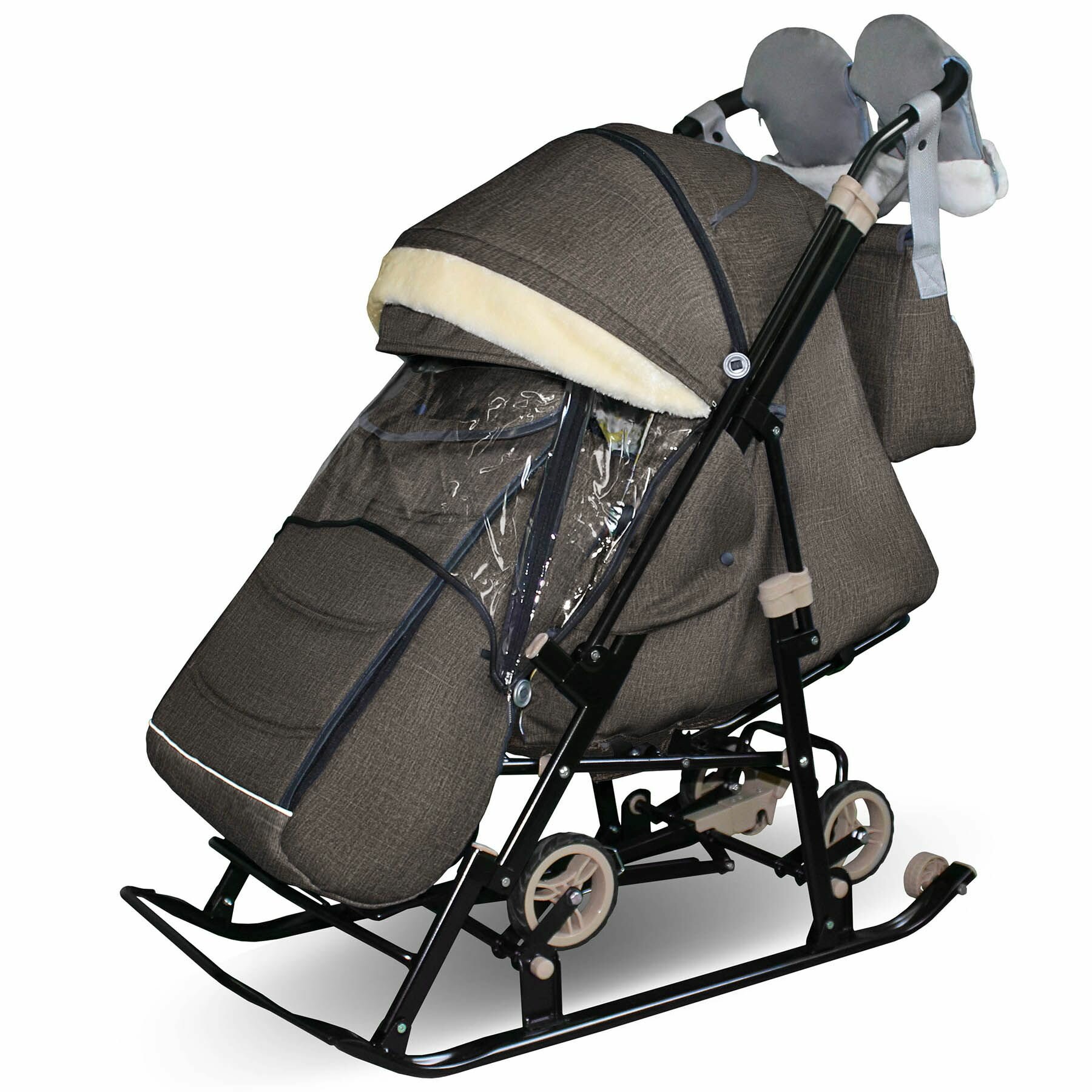Санки коляска детские зимние Galaxy Glory с колесами и перекидной ручкой, серо-коричневый лен интересное: