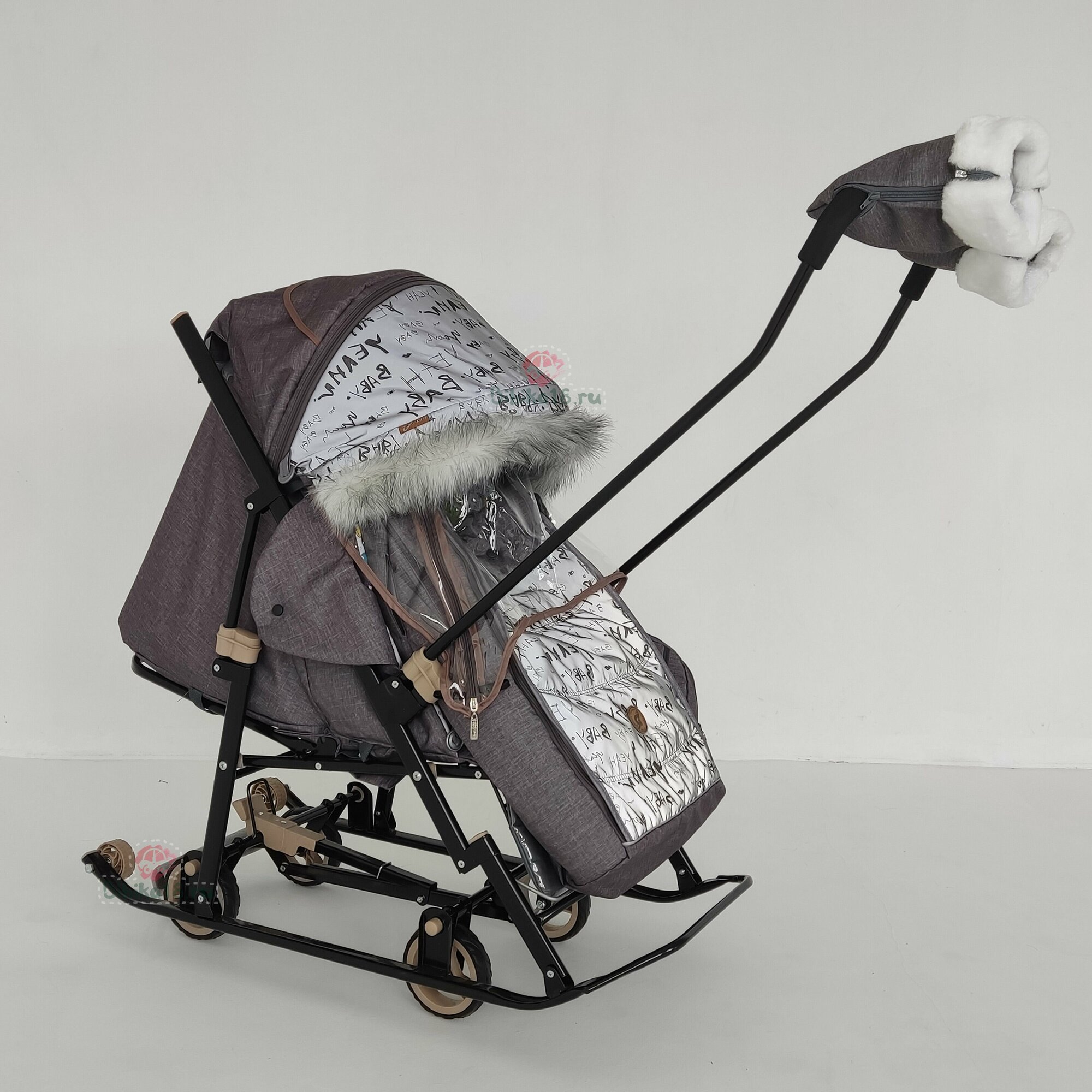 Купить Санки коляска Galaxy Glory Gloss с перекидной ручкой в максимальной комплектации. Цвет серо-коричневый лен со светоотражающей тканью.