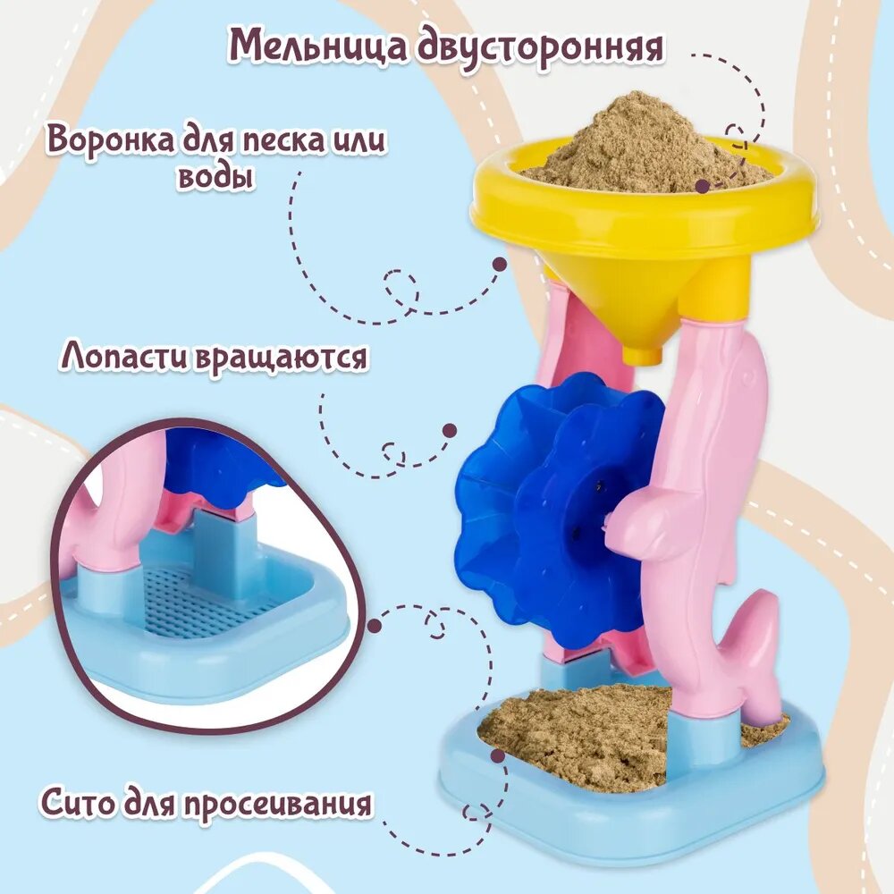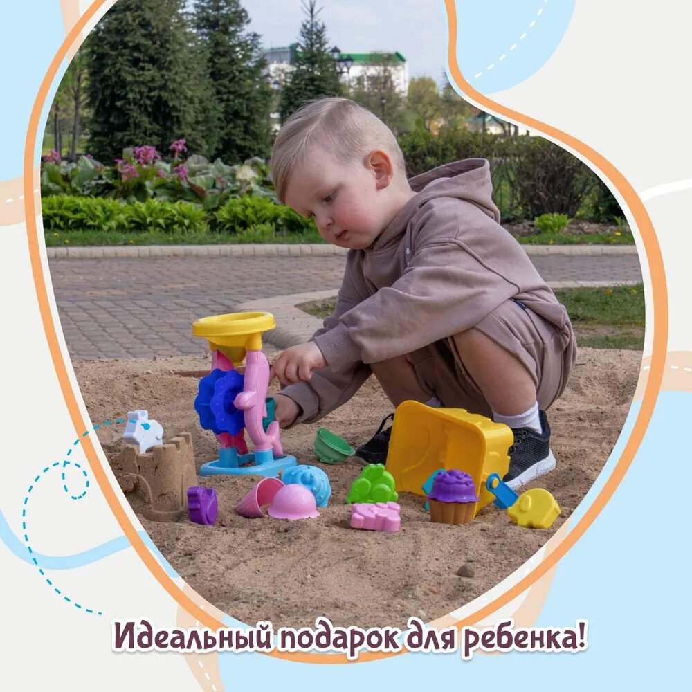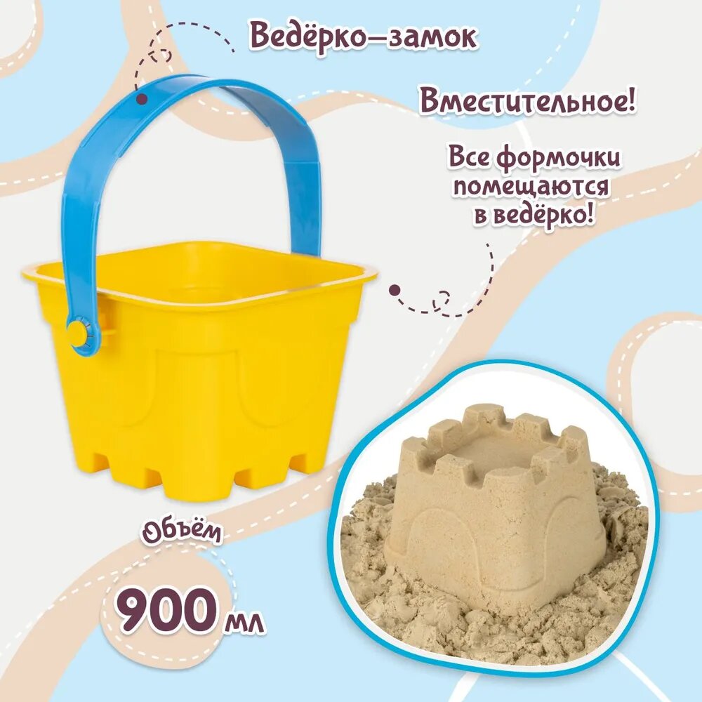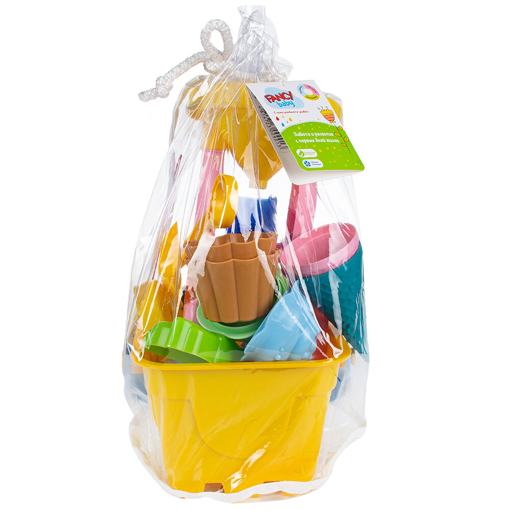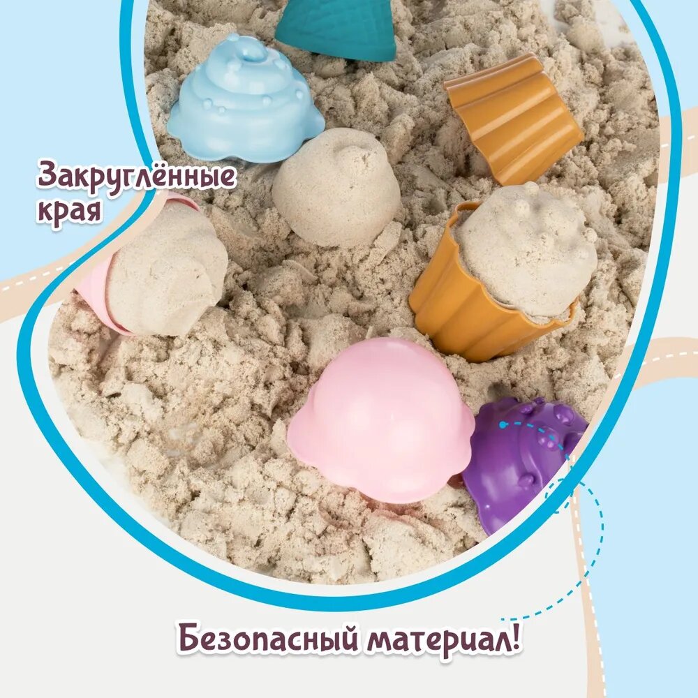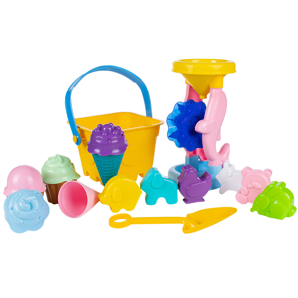 | Комплектация | ведёрко 1 шт., формочки "Зверята" 6 шт., формочки для кексиков: 2 кексика и 2 крышечки, формочки для мороженого: 2 рожка и 2 крышечки, лопатка 1 шт., песочная мельничка 1 шт. |