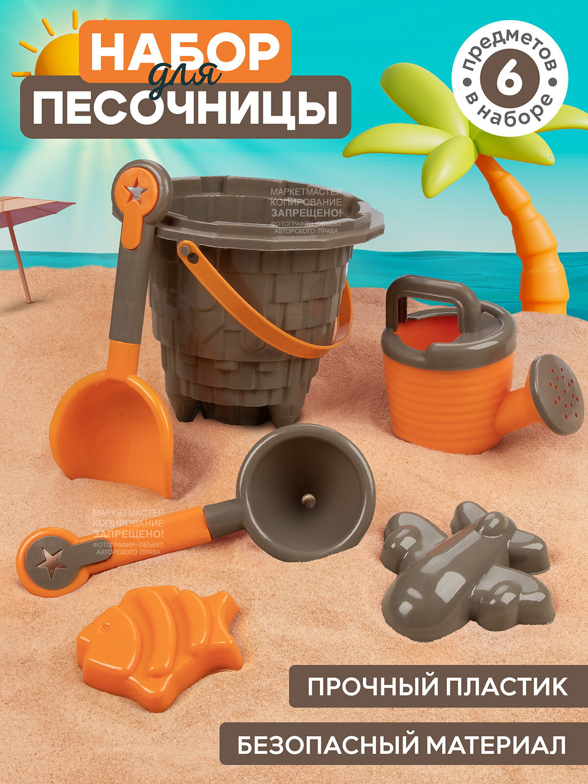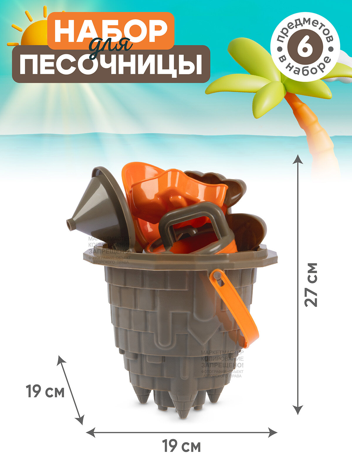 Компания Друзей Песочный набор "Замок" №91 оранжево-коричневый(в комп. ведро 1,2 л, лопатка 23см, воронка 21,5см, 2 формочки 10 см, лейка 0,2 л) 27х19х19 см JB5300635