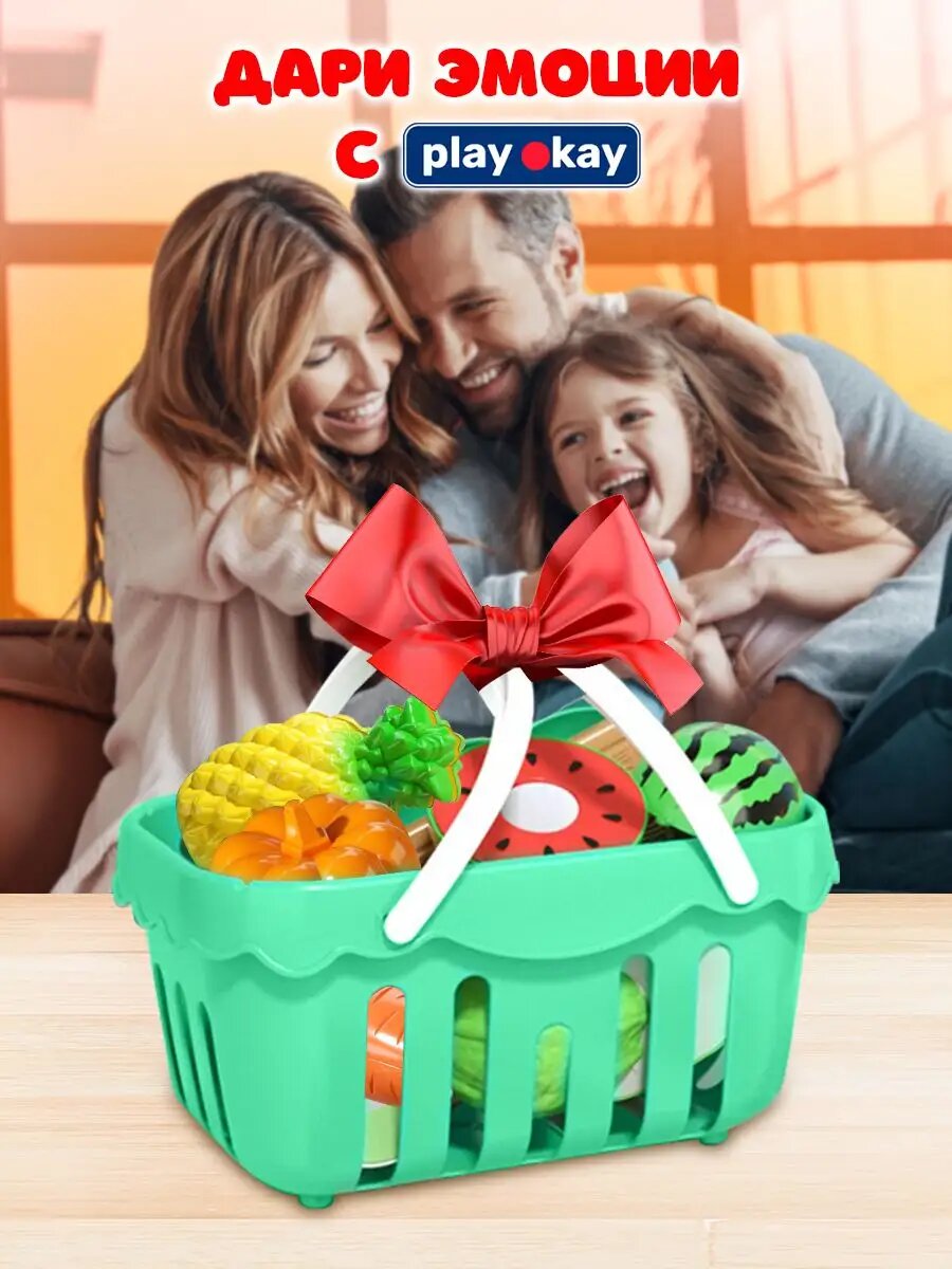 Фрукты и овощи на липучке Play Okay, 32 предмета, игрушечные продукты с кухонными принадлежностями для нарезки еды и корзинкой, детские / Набор игровой