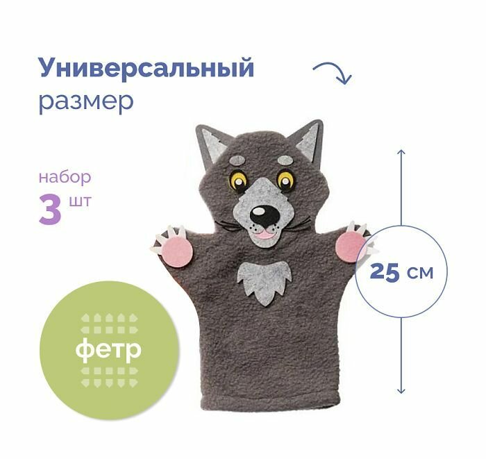 Кукла-рукавичка на руку Smile Decor "Заяц, волк и лиса", мягкая игрушка-перчатка для кукольного театра, набор из 3 перчаточных кукол из флиса и фетра