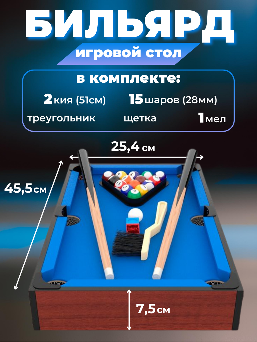 | Комплектация | 2 кия, набор из 15 шаров, треугольник, щётка, мел |