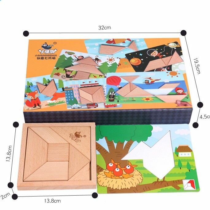 | Комплектация | 15 ярких карточек двух размеров с вырубкой под детали танграма, 7 деревянных геометрических фигур, основа-квадрат из дерева |
