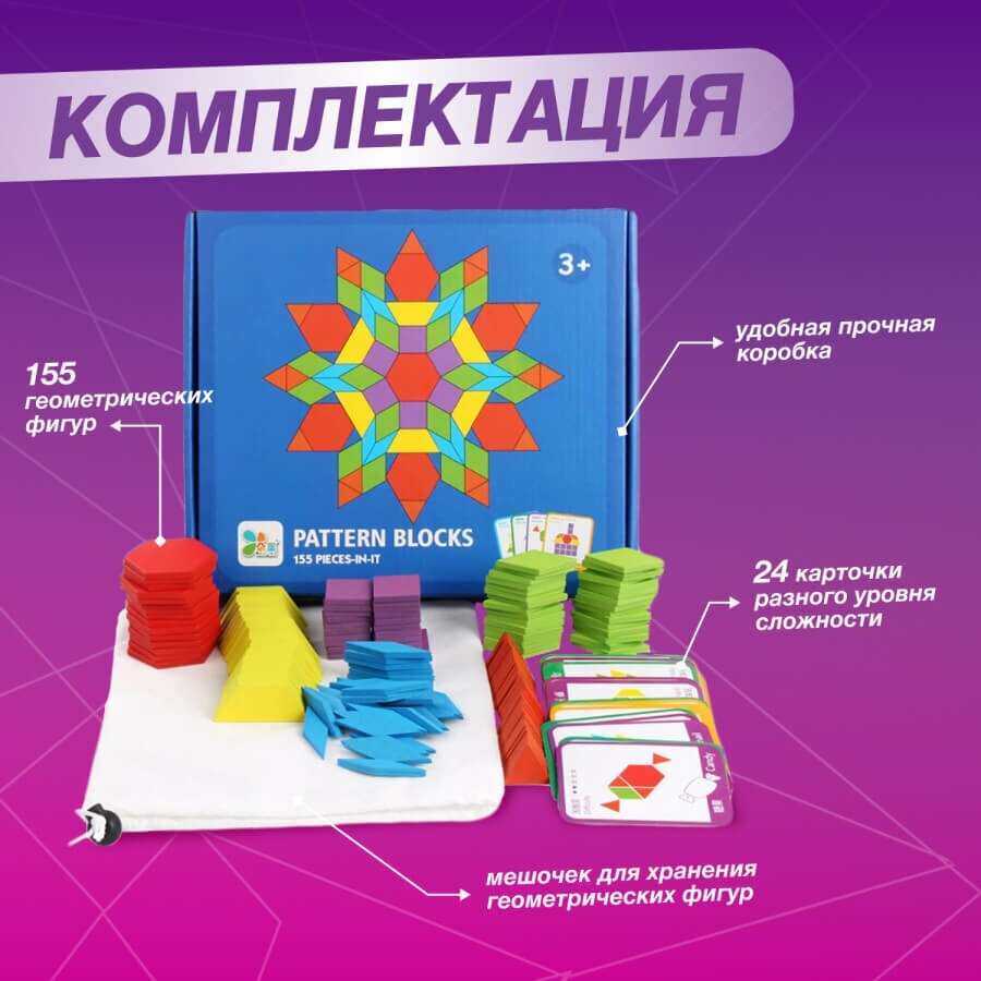 | Комплектация | Набор геометрических фигур - 155 шт, Карточки с заданиями - 24 шт |