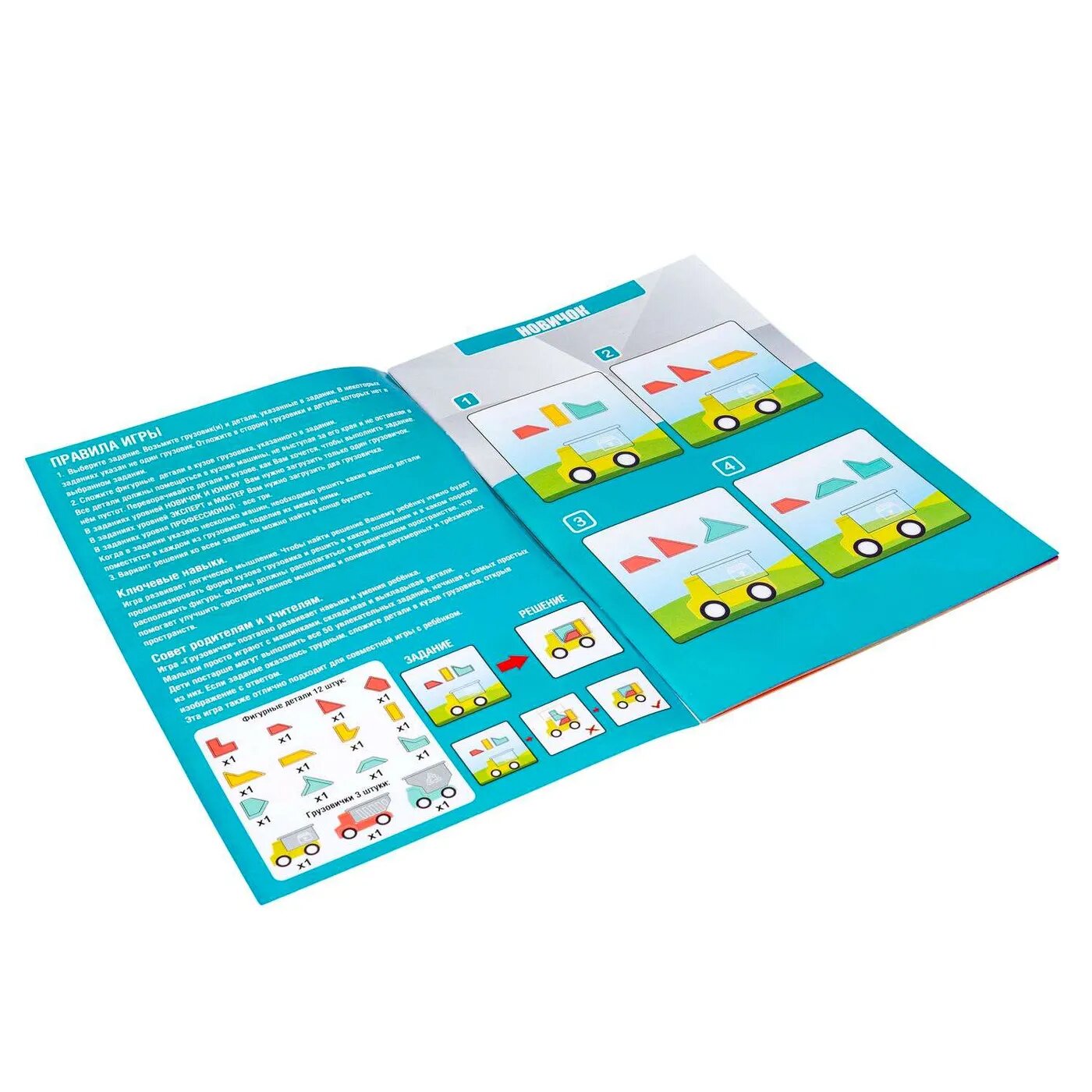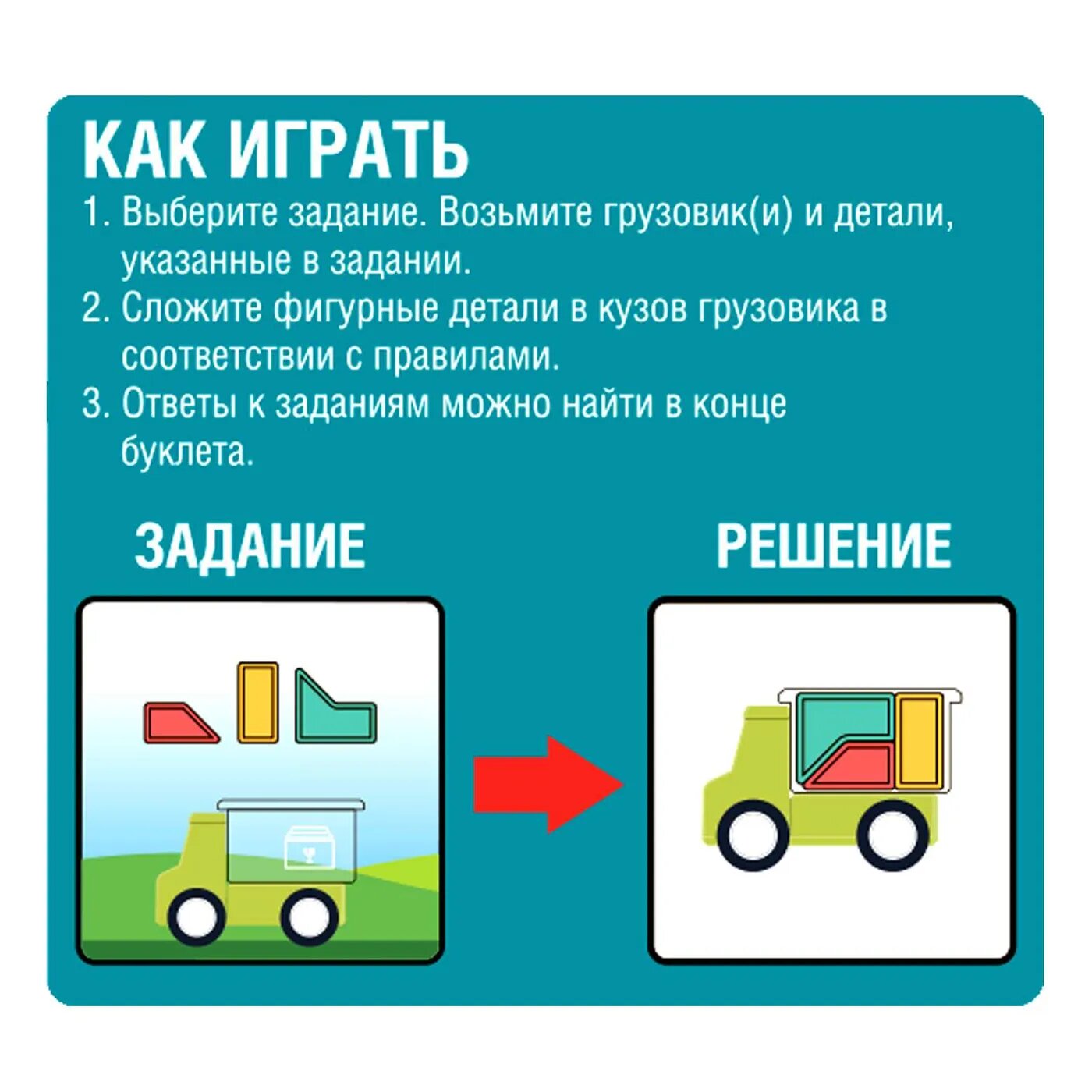 | Комплектация | В комплект входят: 3 грузовичка, 12 фигурных деталей, буклет с правилами, заданиями и решениями. Количество игроков: 1, возраст: 3+. |