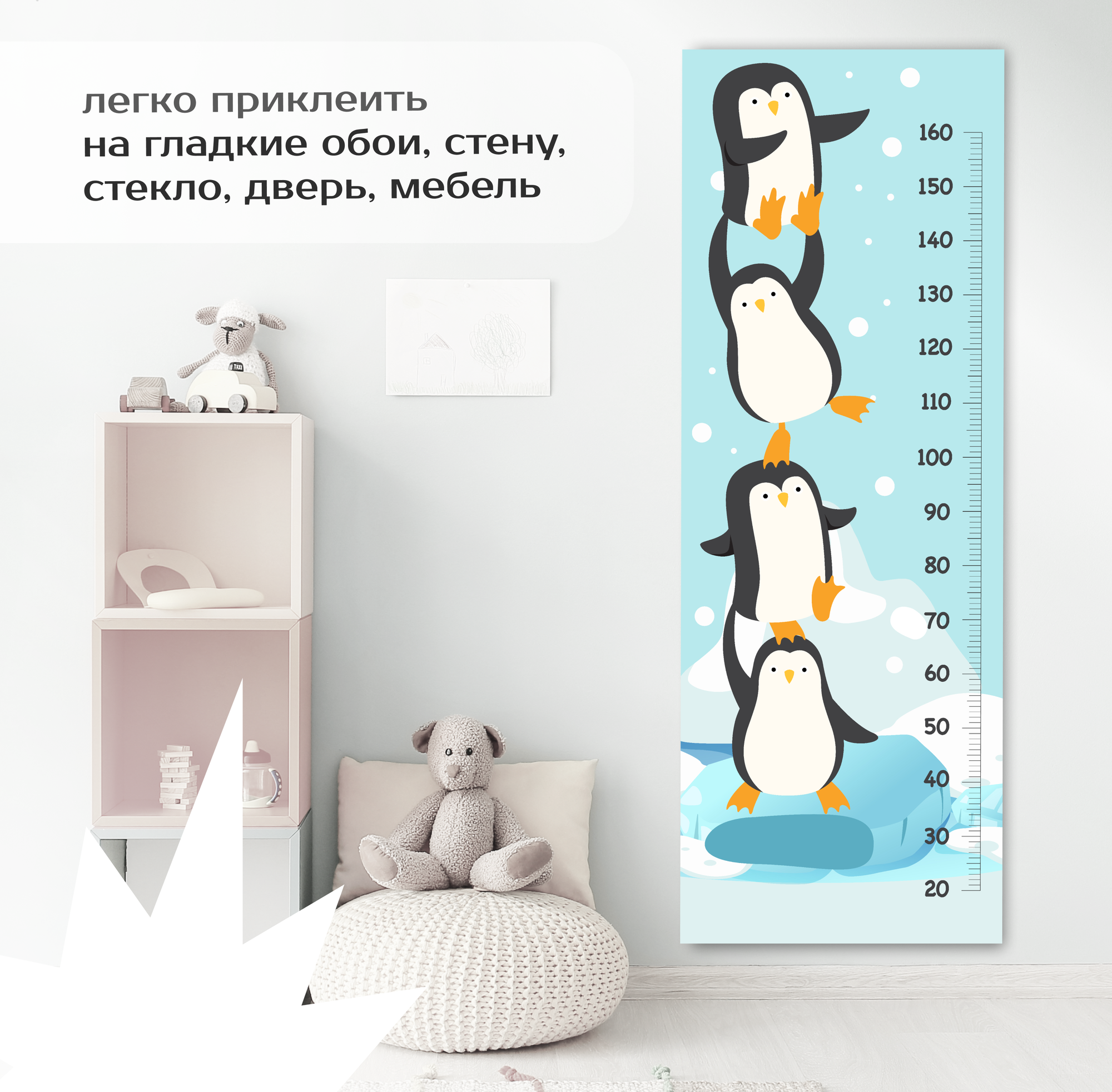 Ростомер интерьерная наклейка для малышей "Пингвины" 60х165 см, линейка на стену для декора в детскую комнату, большой стикер для детского сада; самоклейка с рисунком интересное:
