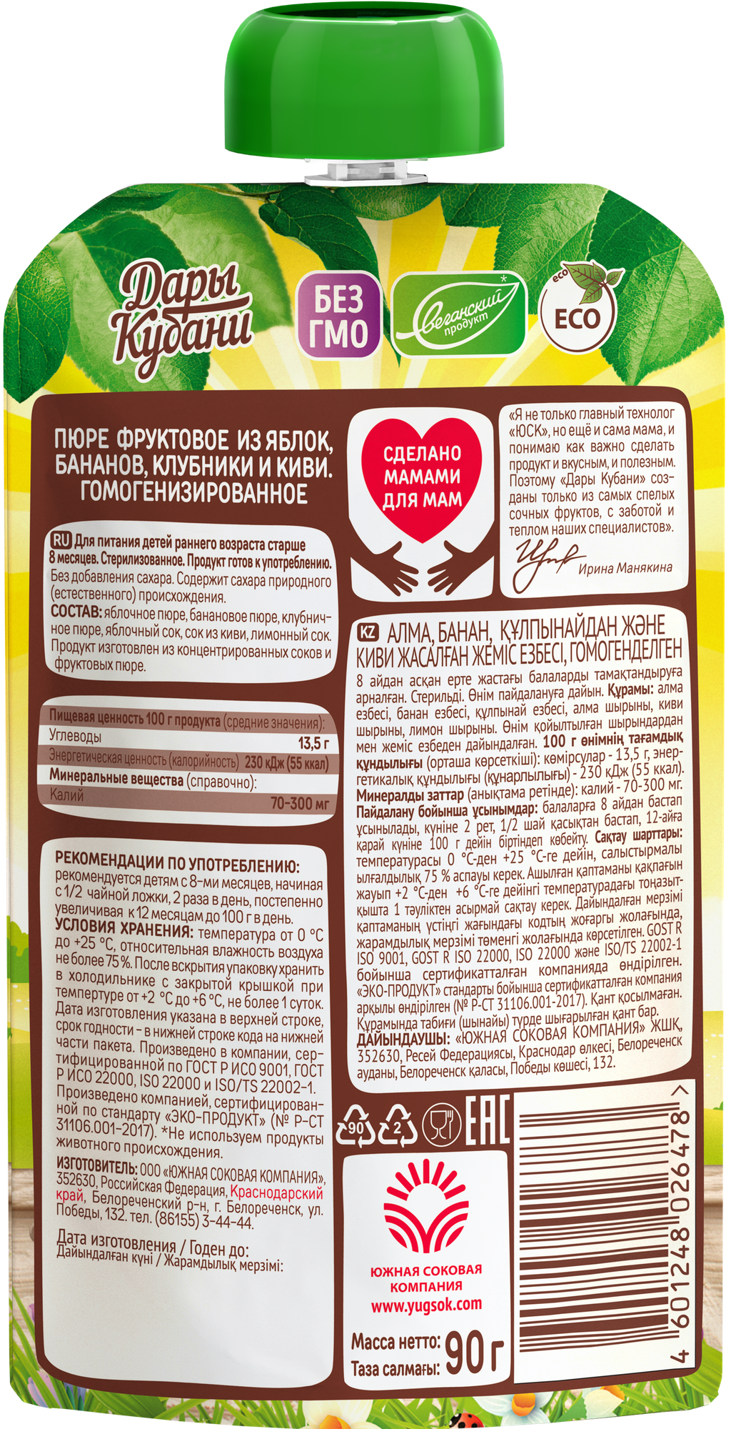 Детское пюре Дары Кубани из яблок, бананов, клубники и киви, без сахара, для детей с 8 месяцев, 90 г х 12 шт. интересное: