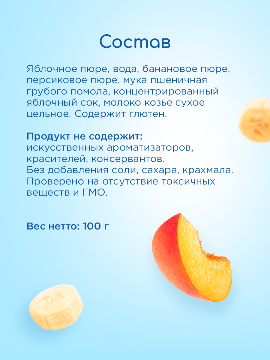 | Состав | яблочное пюре, вода, банановое пюре, персиковое пюре, мука пшеничная грубого помола, концентрированный яблочный сок, молоко козье сухое цельное. Содержит глютен. |