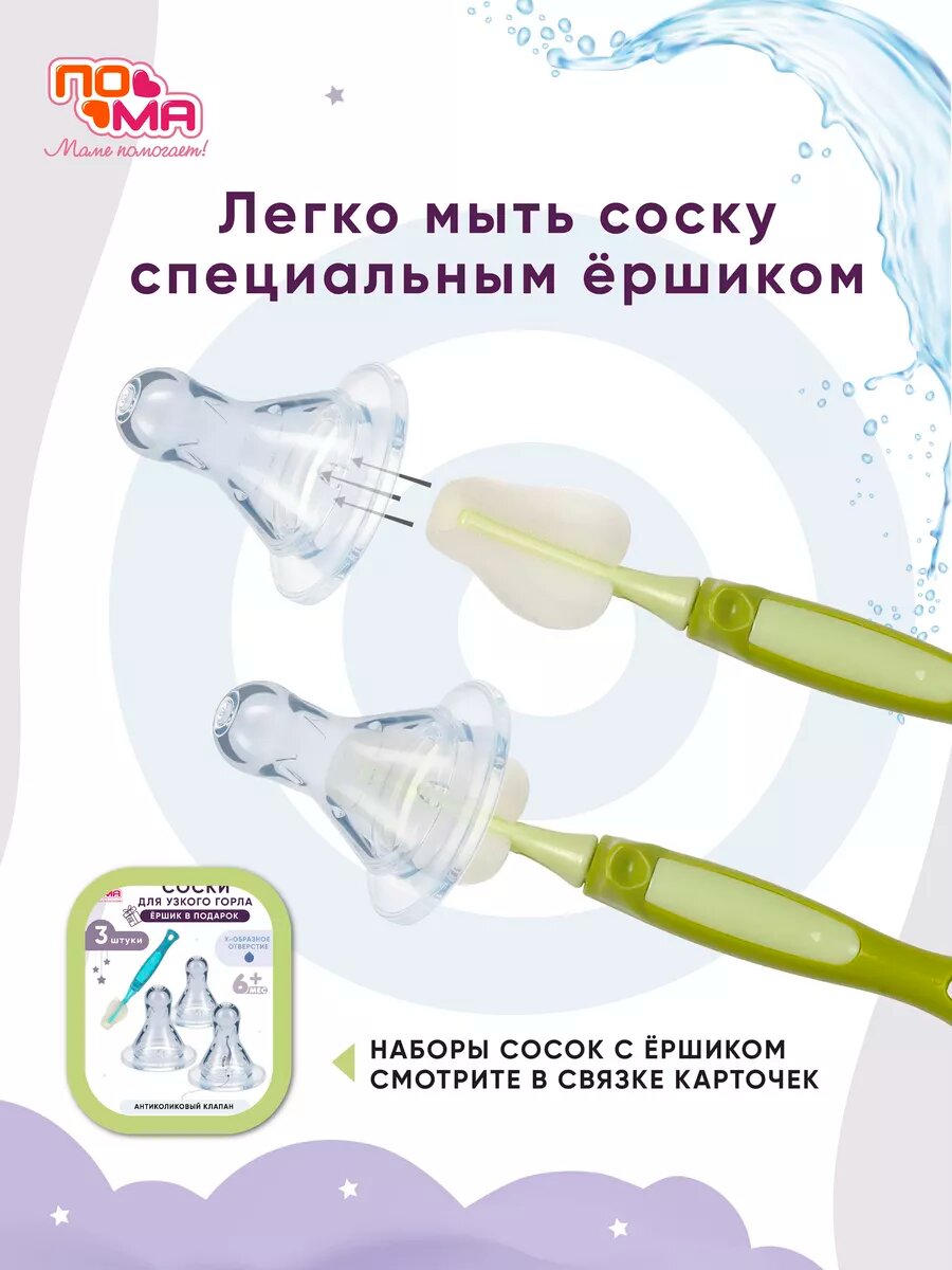 Набор сосок ПОМА, силикон, антиколиковый, с 6 мес, ёршиком в подарок