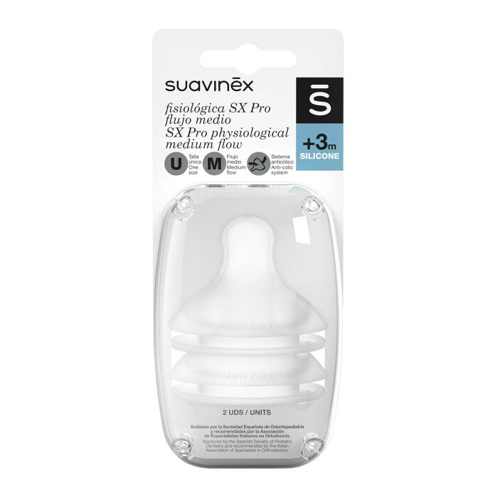 Набор (2шт) силиконовых физиологических сосок для бутылочек Suavinex SX Pro с 3 мес.+ с противоколиковым эффектом