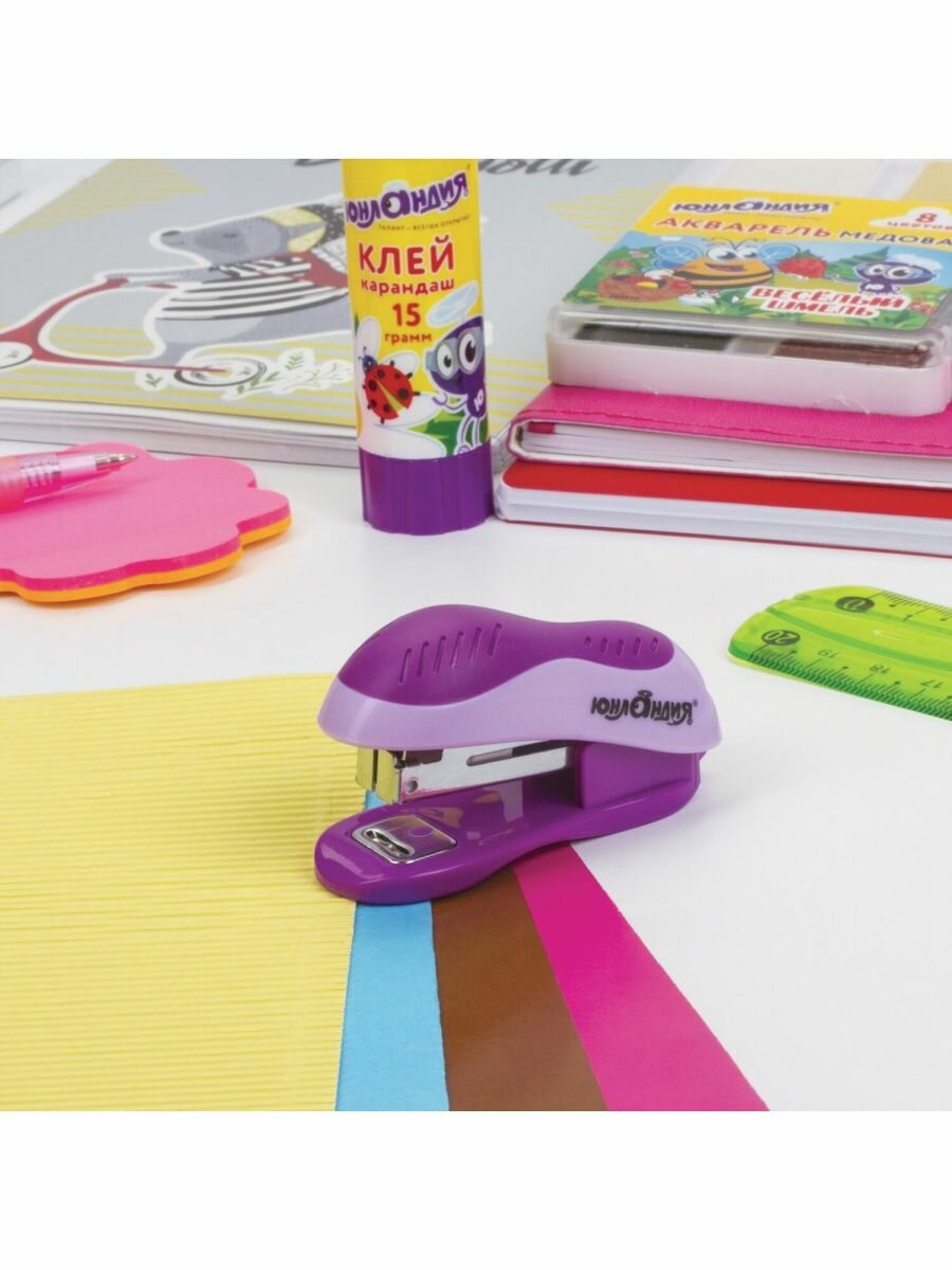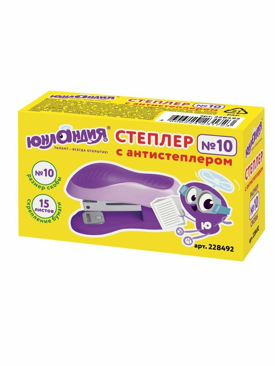 Степлер Юнландия №10, Мини, до 15 листов, с антиом, эргономичный, фиолетовый